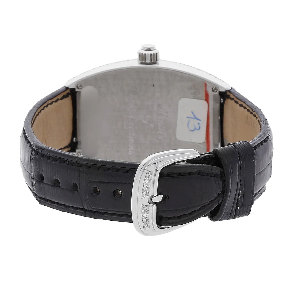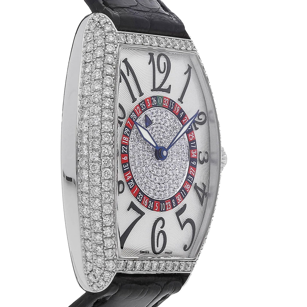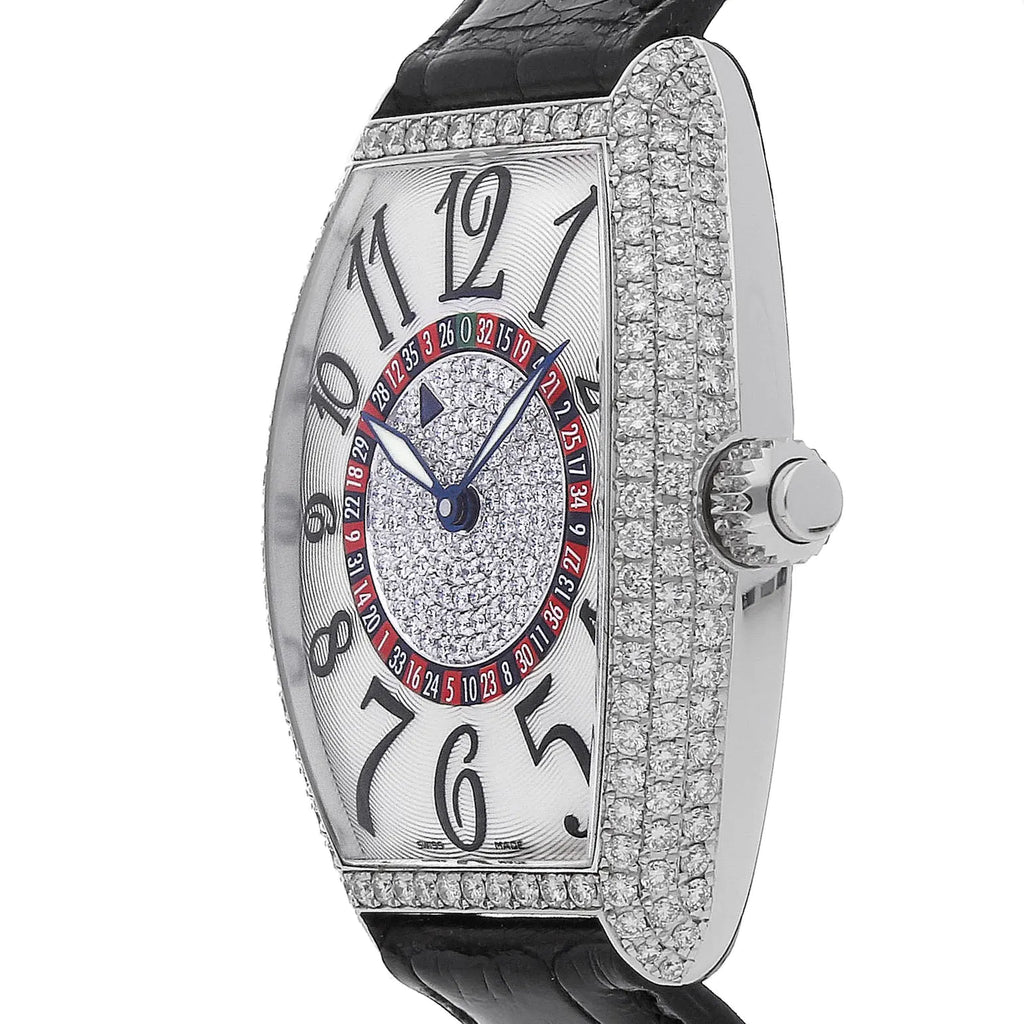 Pre-Owned Franck Muller Cintree Curvex Vegas (5850VEGASD) self - winding automatic watch, features a 32mm x 39mm 18k white gold case with diamond case and lugs surrounding a silver diamond dial on a black alligator strap with an 18k gold tang buckle. Functions include hours, minutes and a roulette wheel. This watch comes complete with box and papers. We back this watch with a 2-Year Watchbox warranty!