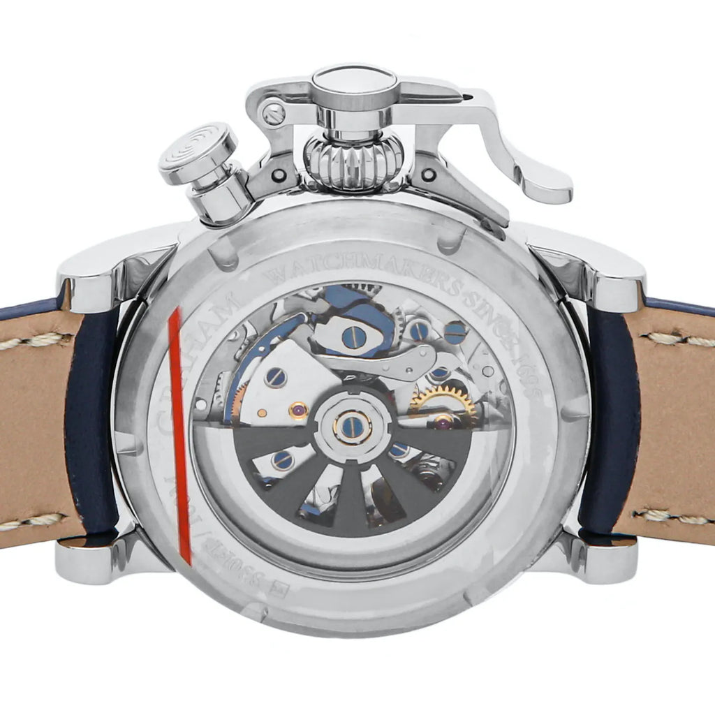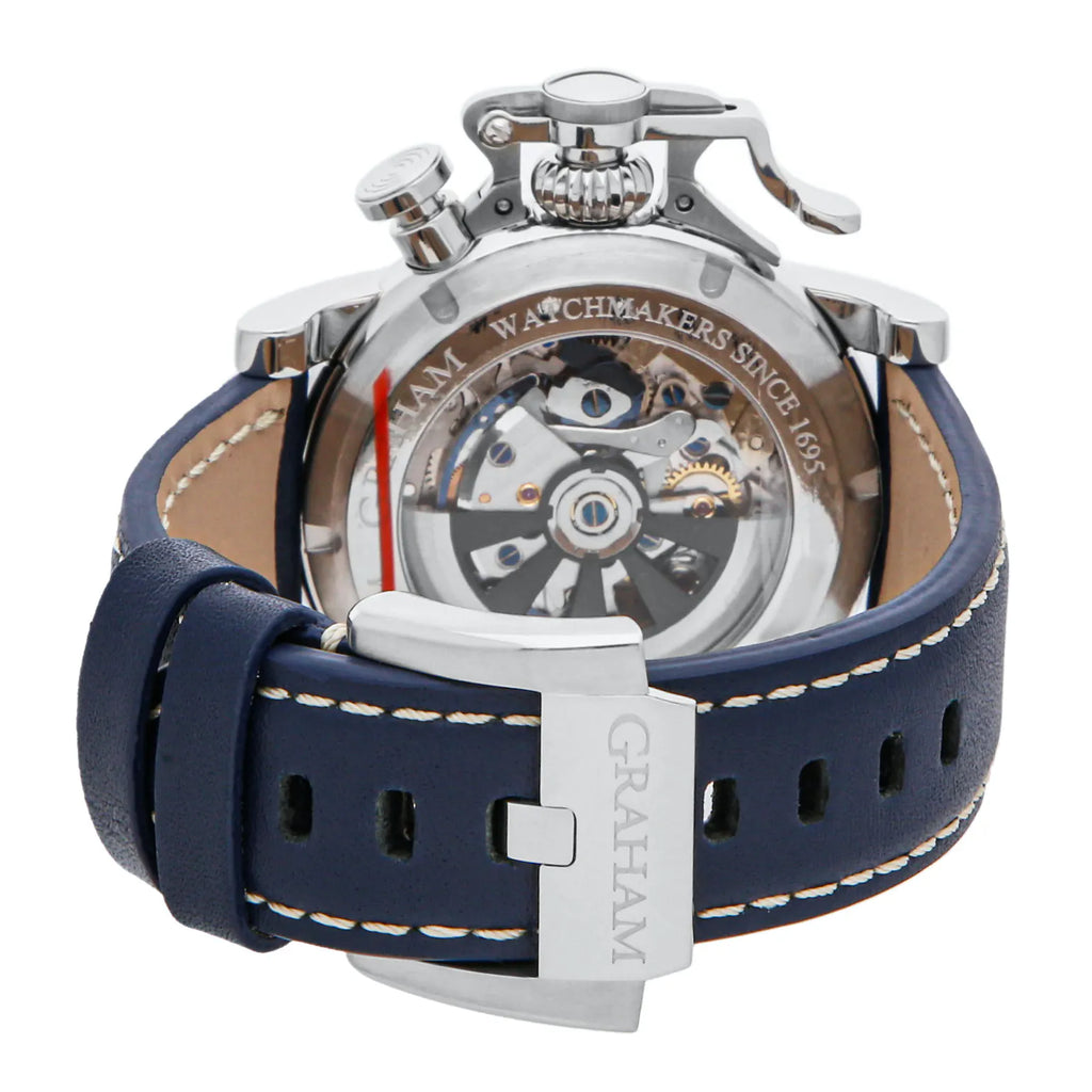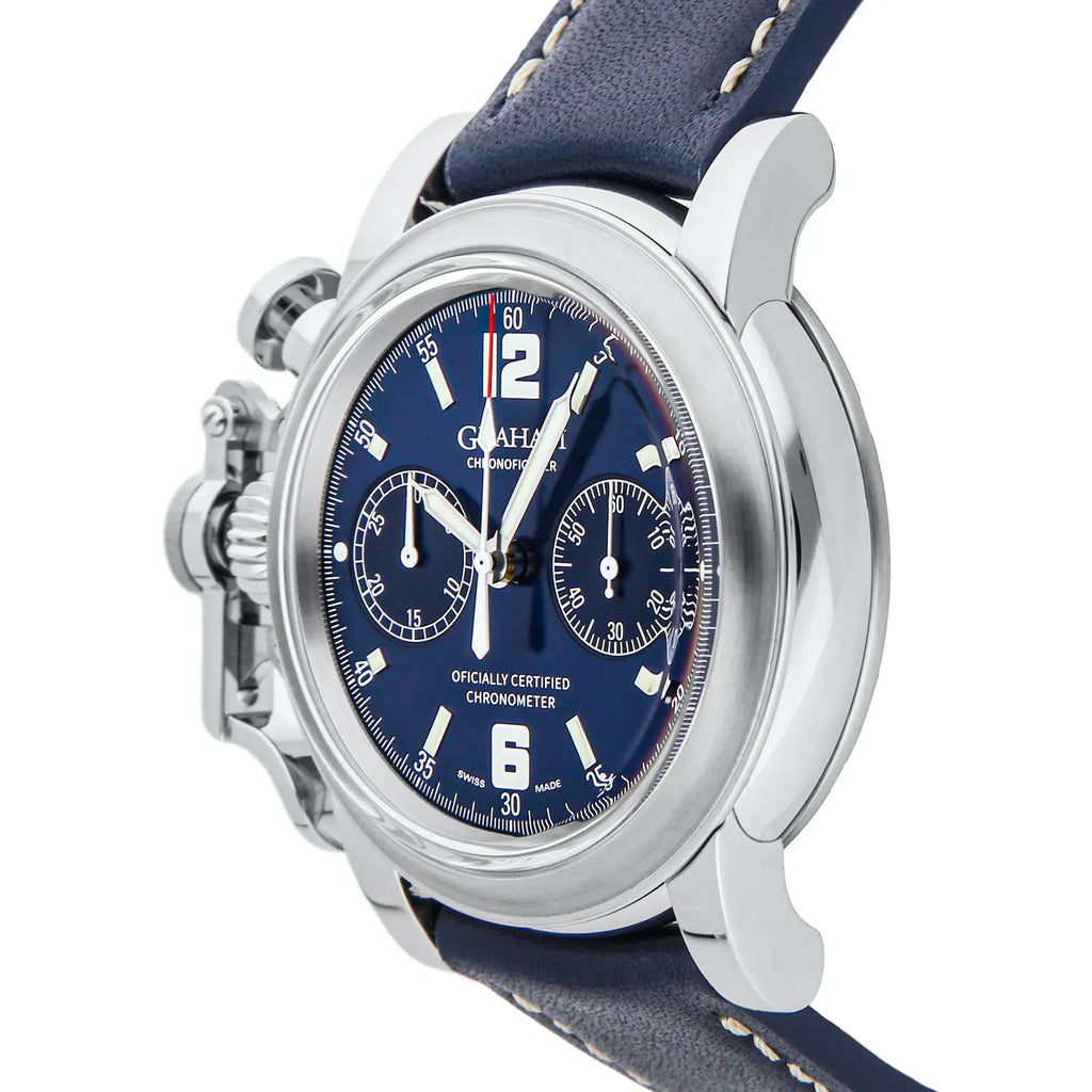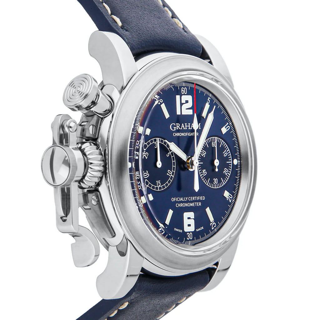 Pre-Owned Graham Chronofighter Vintage 25th Anniversary Limited Edition (2CVESU19A) self - winding automatic watch, feature a 44mm stainless steel case surrounding a blue dial on a navy blue leather strap with a stainless steel tang buckle. Functions include hours, minutes, small seconds and chronograph. This watch comes complete with box and papers. This is a Limited Edition piece of 25! We back this watch with a 2-Year Watchbox warranty!