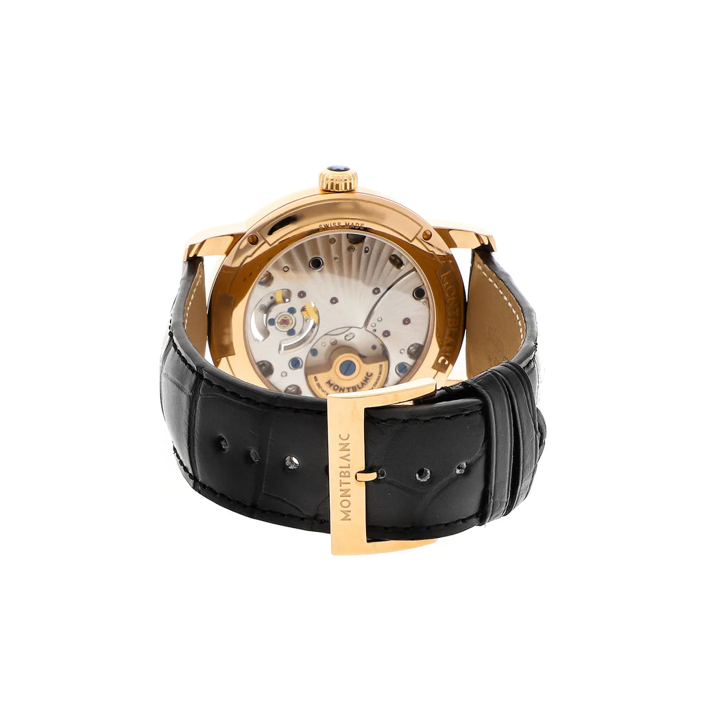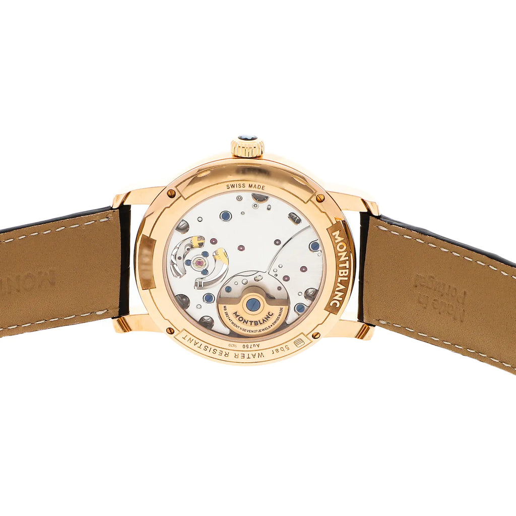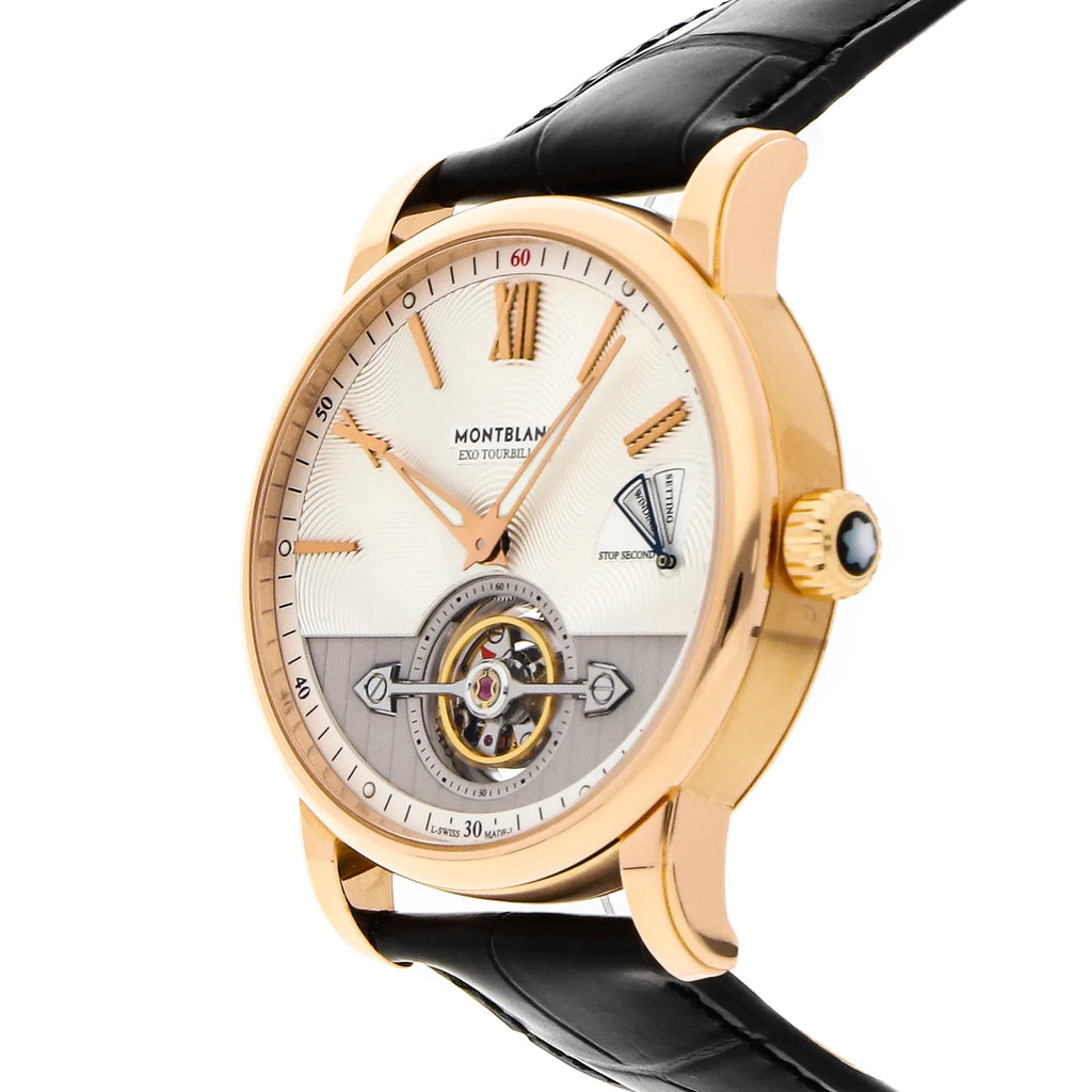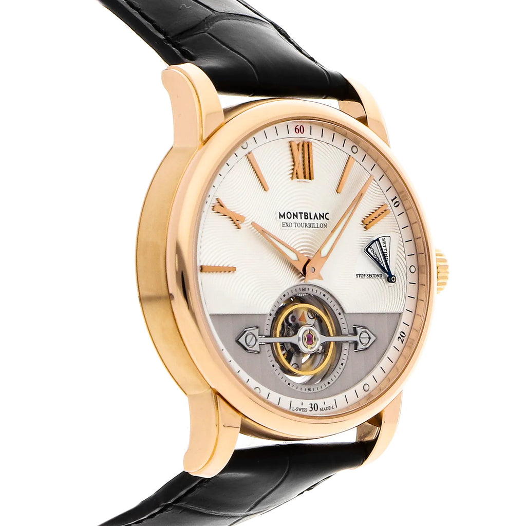 Pre-Owned Montblanc Exo Tourbillon Slim (114864) self - winding automatic watch, features a 42mm 18k rose gold case surrounding a silvery white guilloche dial on a black alligator strap with an 18k rose gold tang buckle. Functions include hours, minutes, tourbillon and power reserve indicator. This watch has been serviced and comes complete with box and papers. Time remaining on the Manufacturer's service warranty!