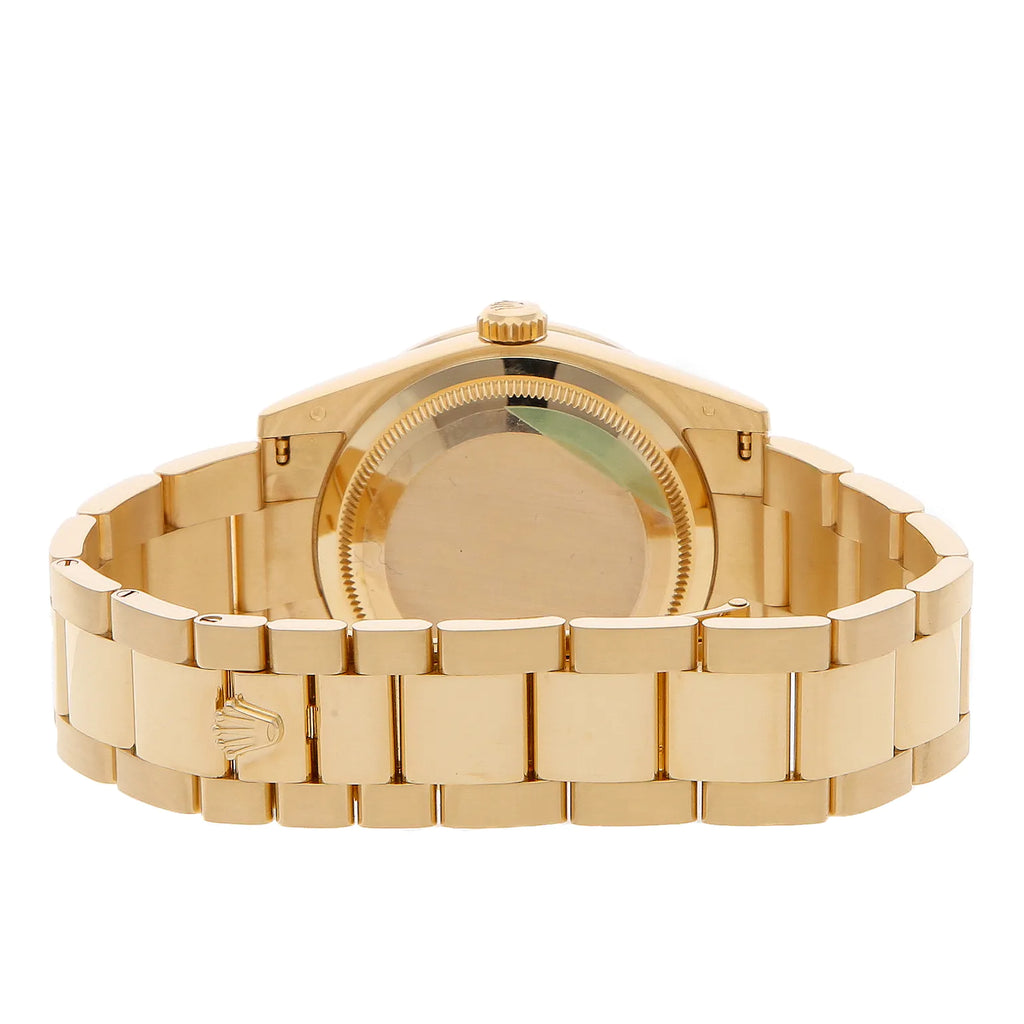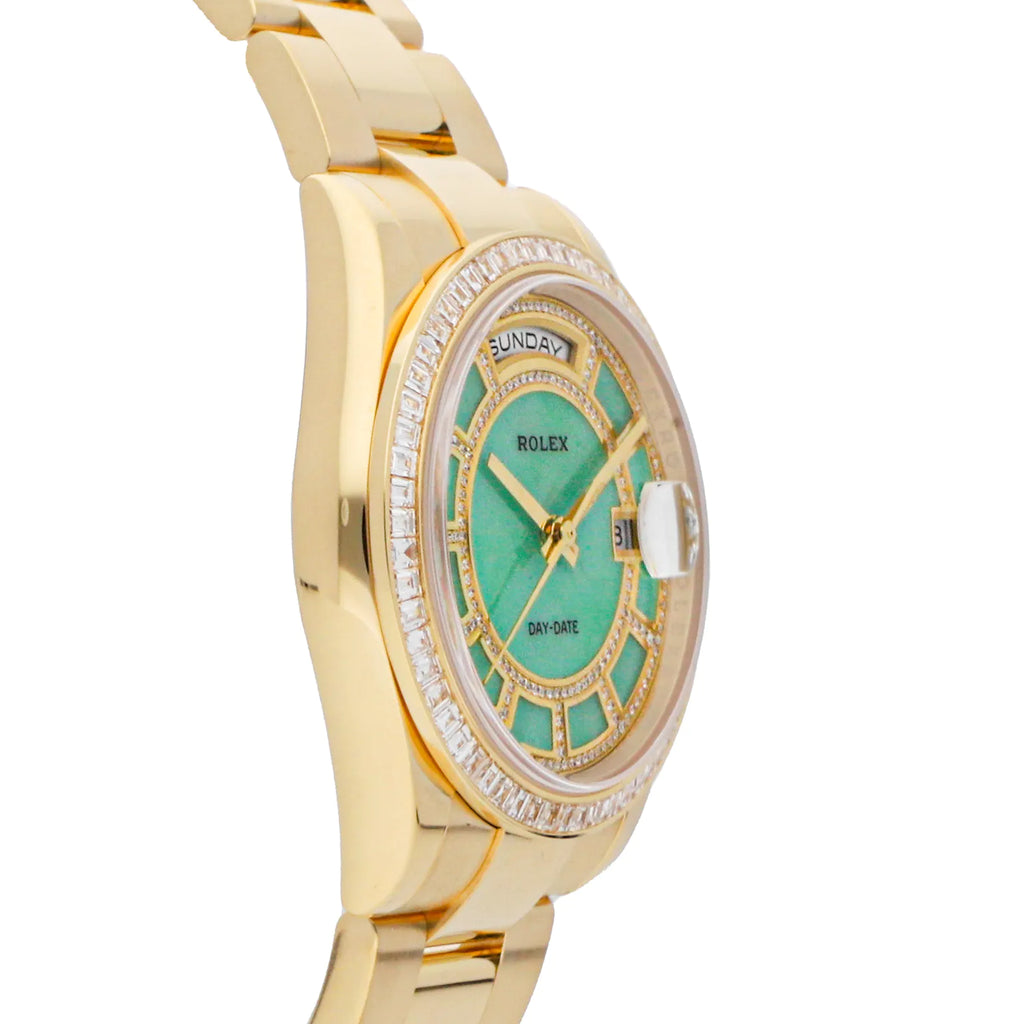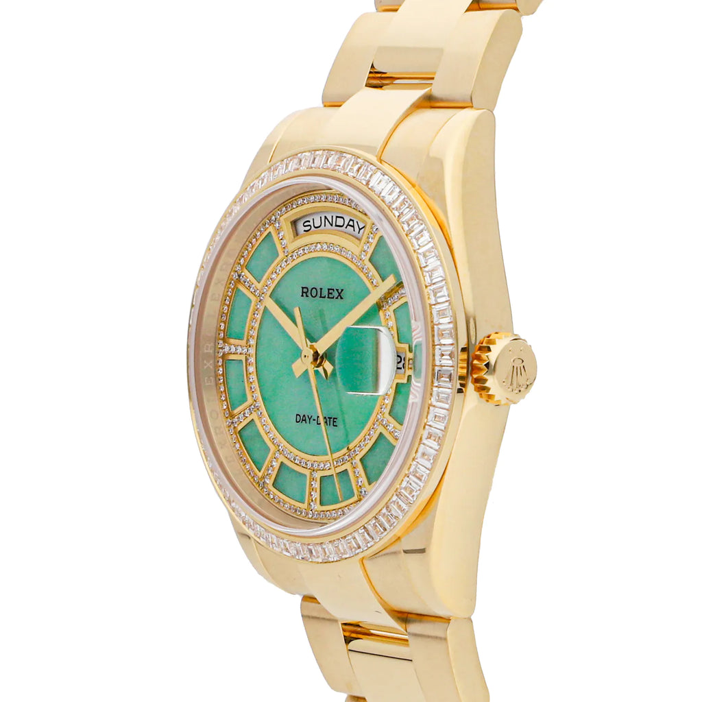 Pre-Owned Rolex Day-Date (118398) self - winding automatic watch, features a 36mm 18k yellow gold case with a diamond bezel surrounding a jade diamond Carousel dial on an 18k yellow gold Oyster bracelet with folding buckle. Functions include hours, minutes, seconds, day and date. This watch comes with the original warranty. Scattered Serial. We back this watch with a 2-Year Watchbox warranty!