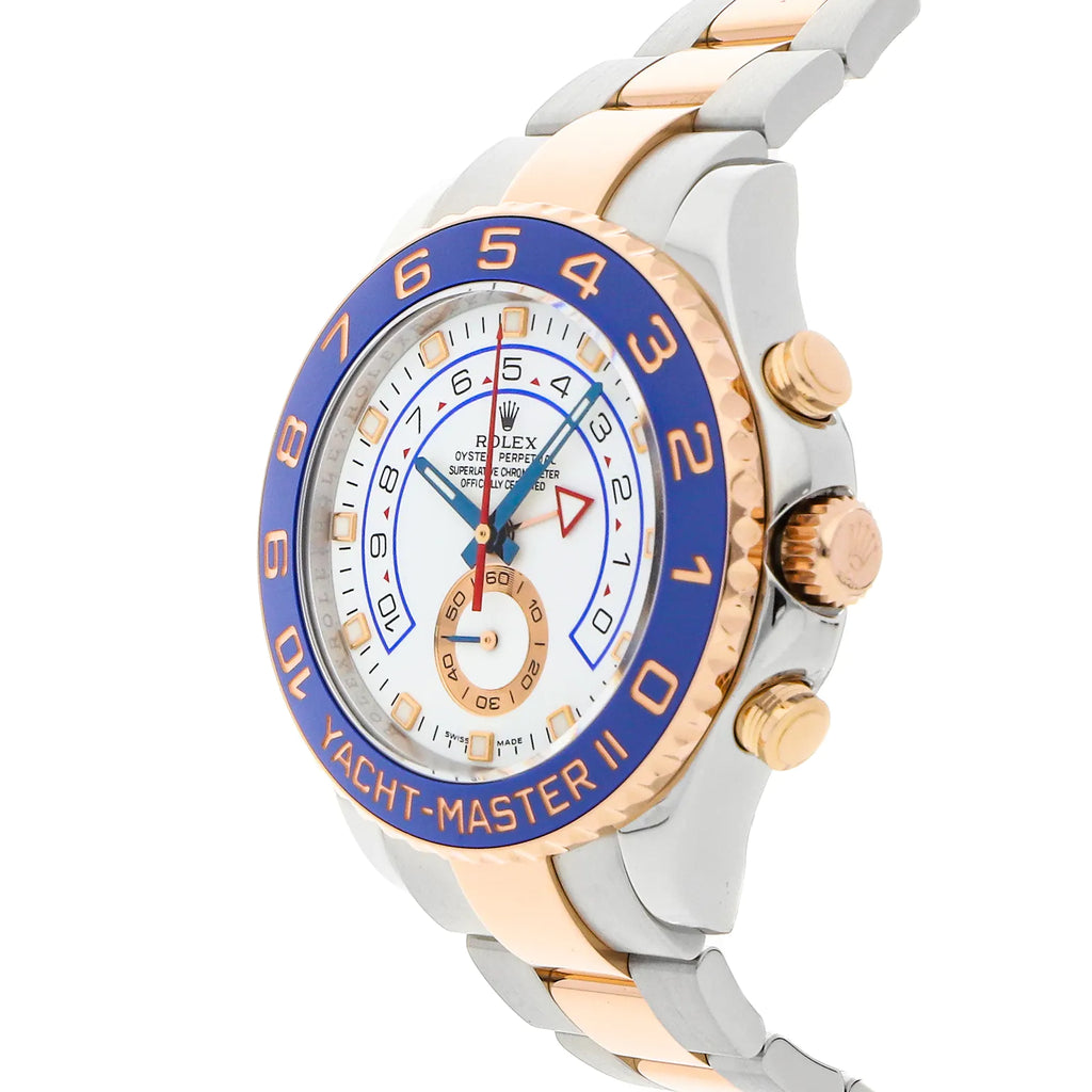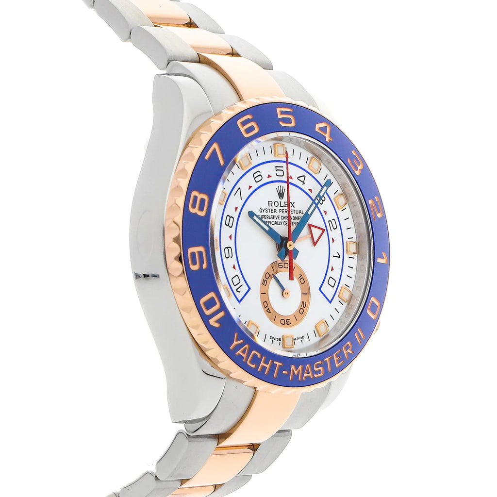 Coming soon! This item will be available to ship in 3-6 weeks. Photo is representative-only. Pre-Owned Rolex Yacht-Master II (116681) self-winding automatic watch, features a 44mm stainless steel case with an 18k Everose gold and blue Cerachrom bezel surrounding a white dial on a stainless steel and 18k Everose gold Oyster bracelet with folding buckle. Functions include hours, minutes, small seconds, chronograph and regatta timer. This watch comes with the original warranty. Scattered Serial. We back this watch with a 2-year Watchbox warranty!