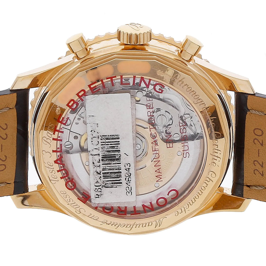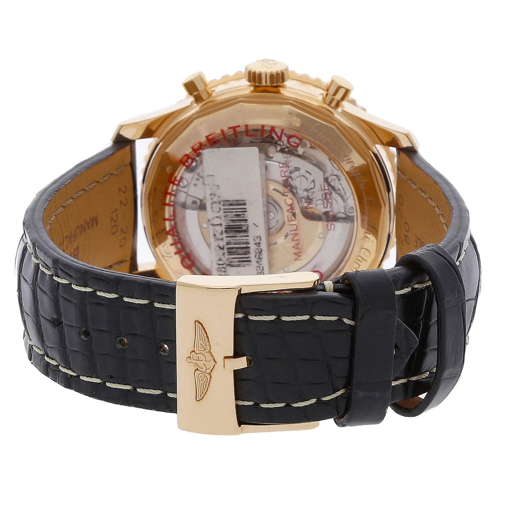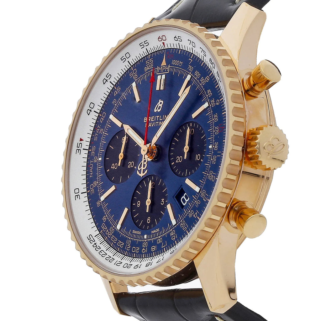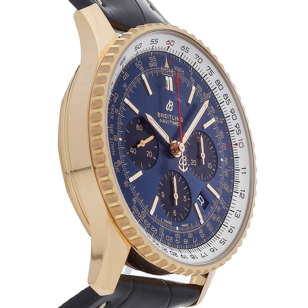 Pre-Owned Breitling Navitimer 1 B01 Chronograph (RB0121211C1P1) self - winding automatic watch, features a 43mm 18k rose gold case surrounding a blue dial on a black alligator strap with a stainless steel tang buckle. Functions include hours, minutes, small seconds, date, slide rule and chronograph. This watch comes complete with box and papers. Majority of time remaining on the factory warranty!