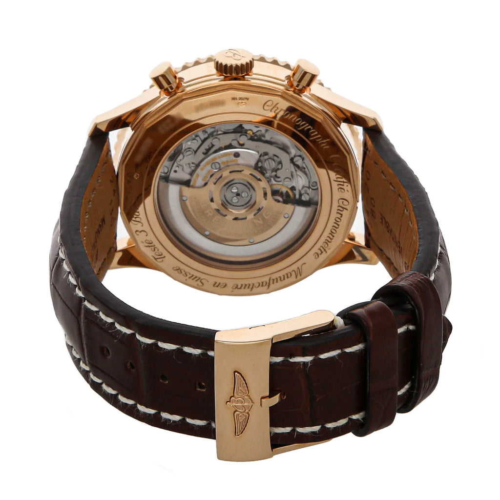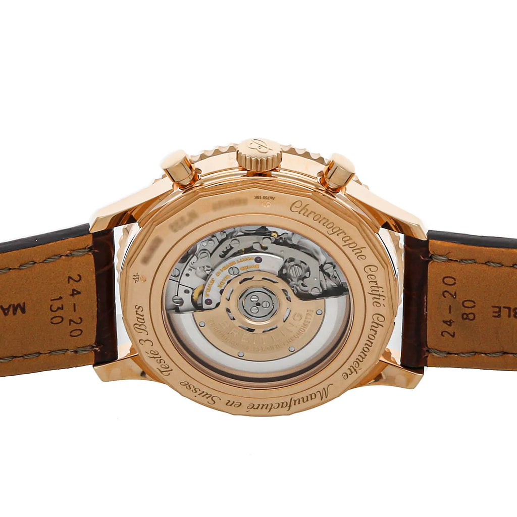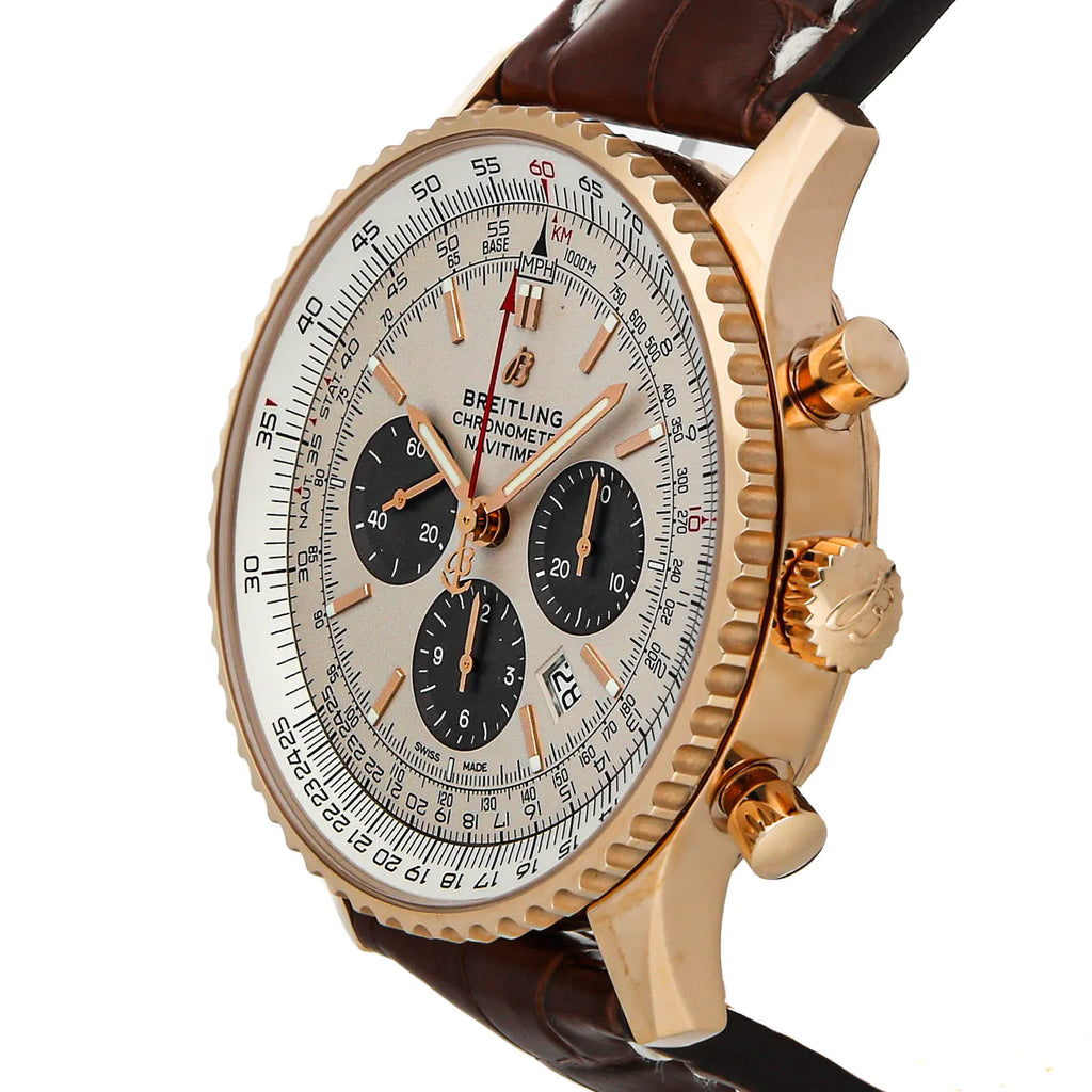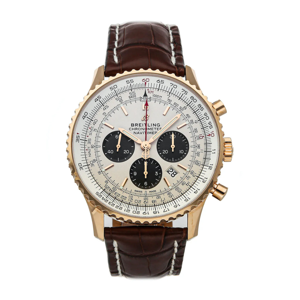 Pre-Owned Breitling Navitimer B01 Chronograph (RB0127121G1P1) self - winding automatic watch, features a 46mm 18k rose gold case surrounding a silver dial on a brown alligator strap with an 18k rose gold tang buckle. Functions include hours, minutes, small seconds, date, chronograph, slide rule and tachymeter. This watch comes complete with box and papers. Majority of time remaining on the factory warranty!