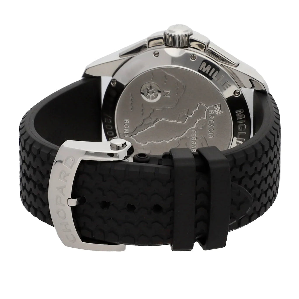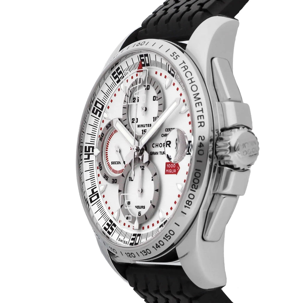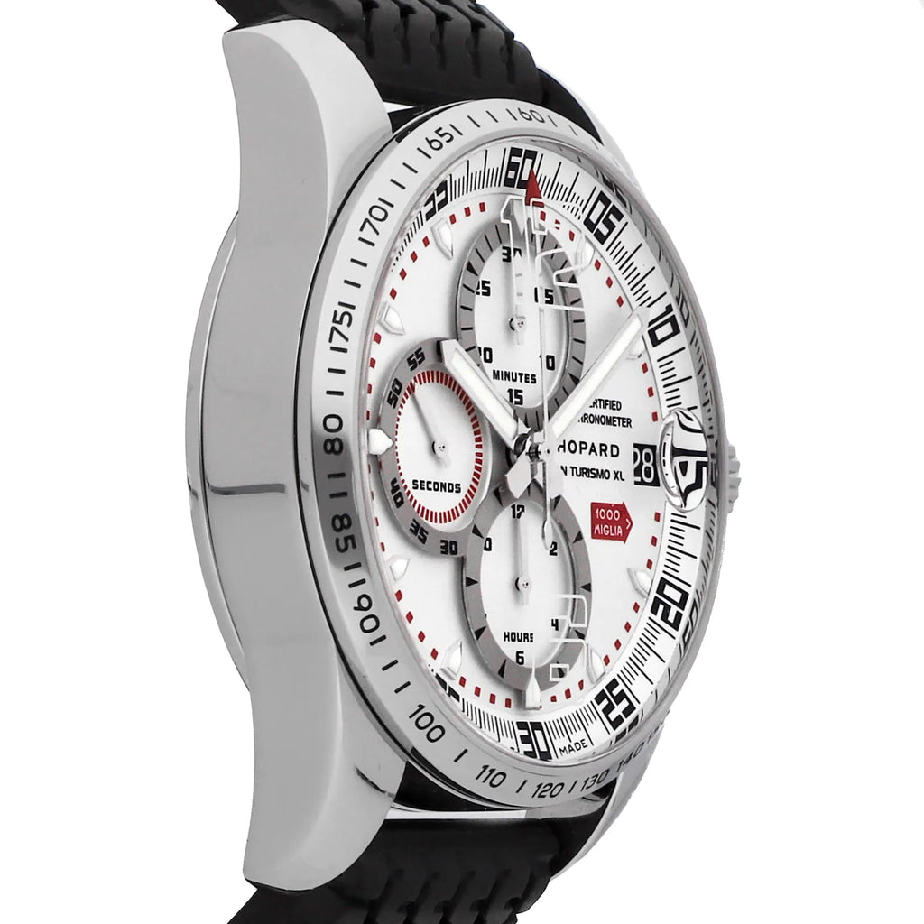 Pre-Owned Chopard Mille Miglia Gran Turismo XL Limited Edition (168489) self - winding automatic watch, features a 44mm stainless steel case surrounding a silver dial on a black rubber tire-tread strap with a stainless steel tang buckle. Functions include hours, minutes, small seconds, date, chronograph and tachymeter. This watch comes with the original box. This is a Limited Edition piece of 2008! We back this watch with a 2-Year Watchbox warranty!