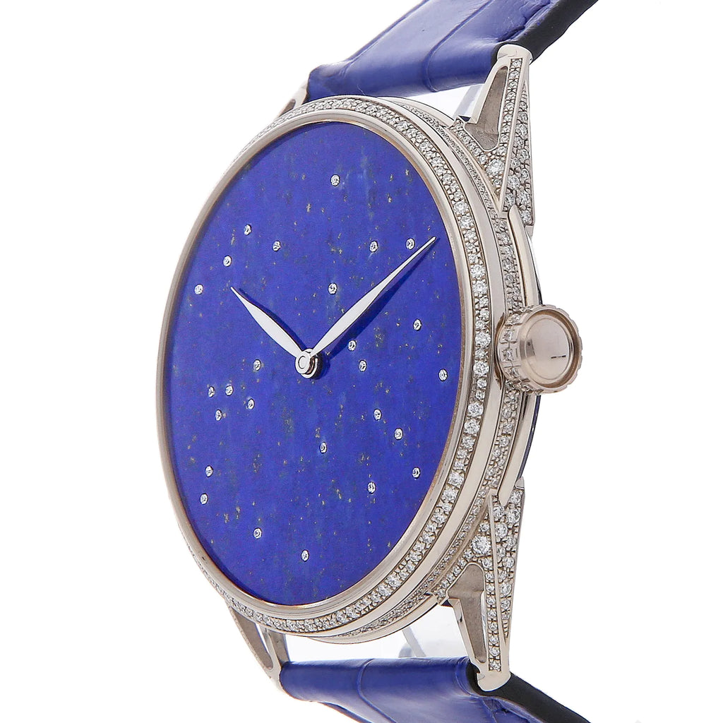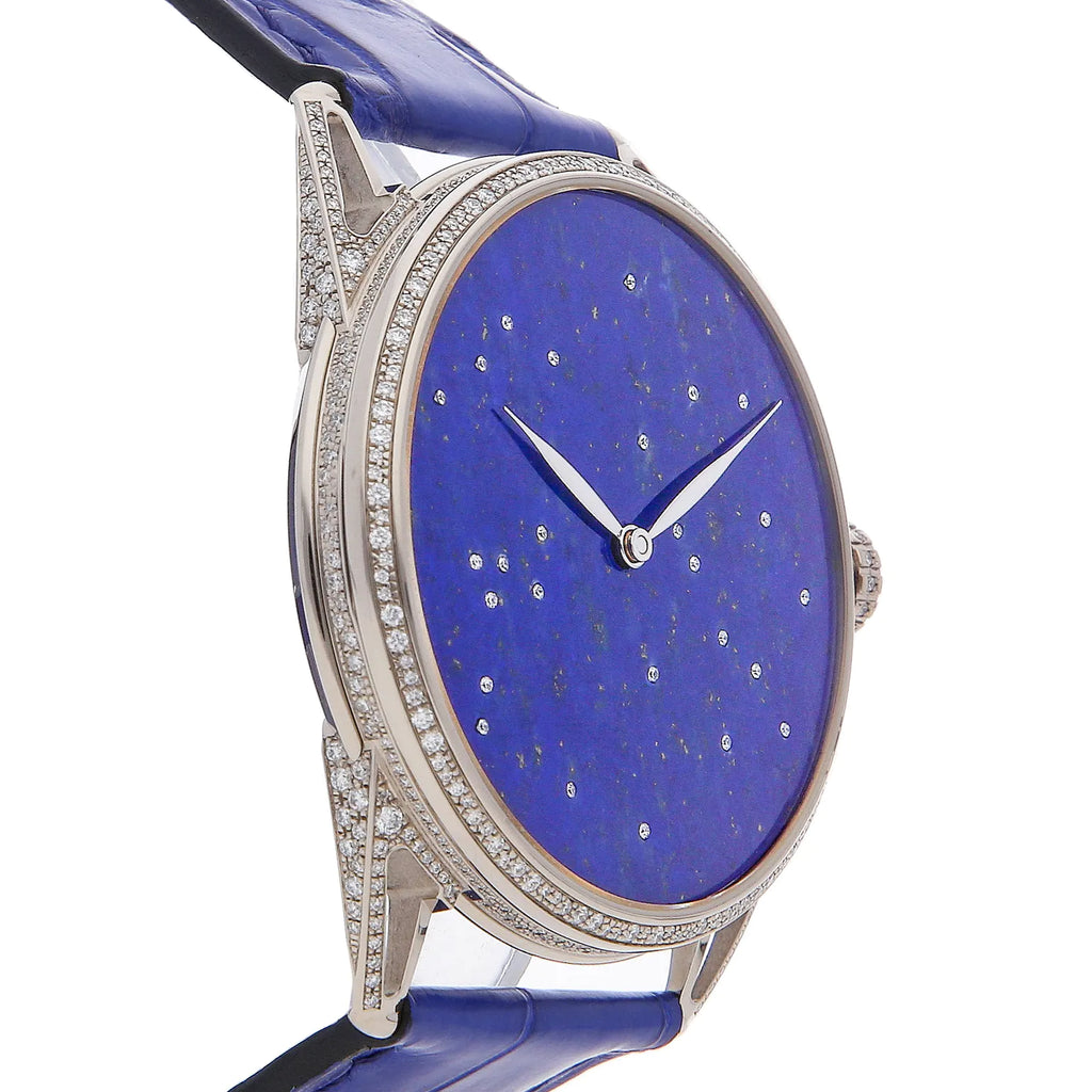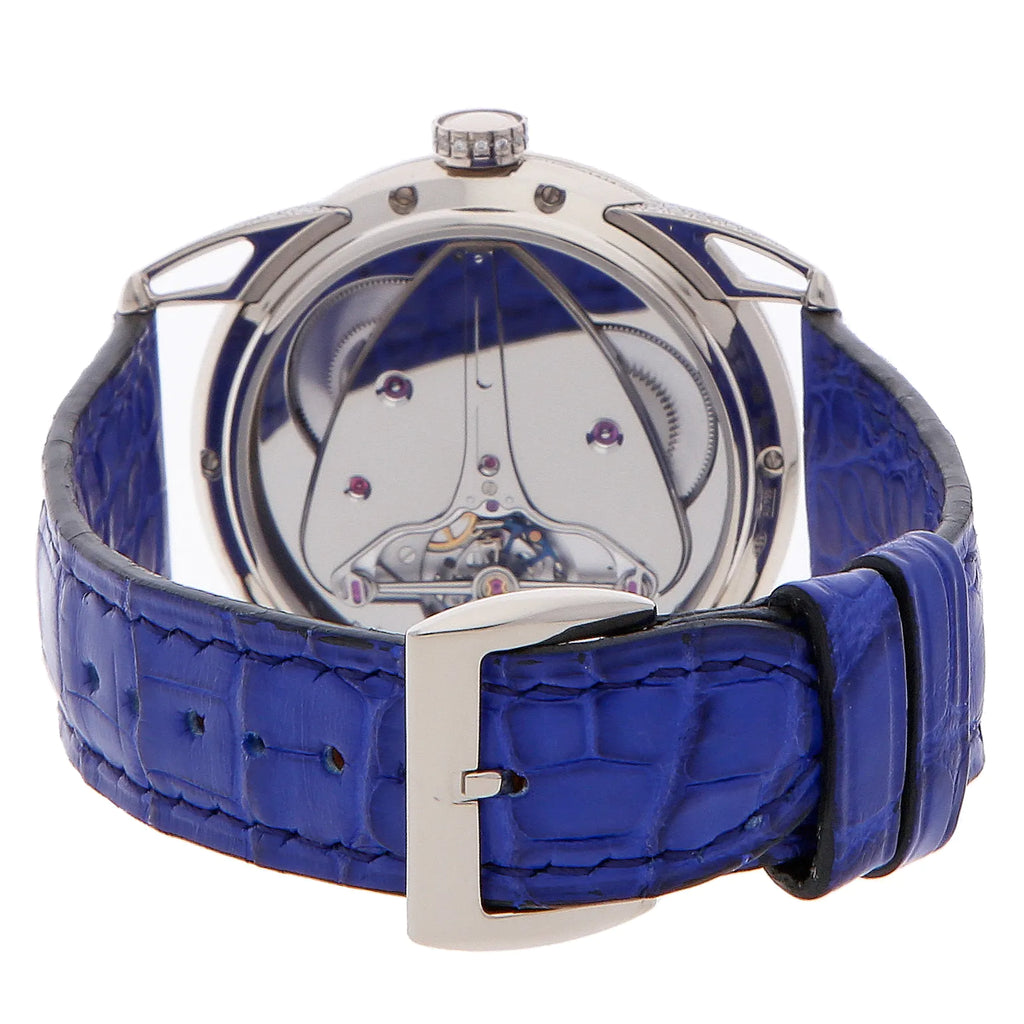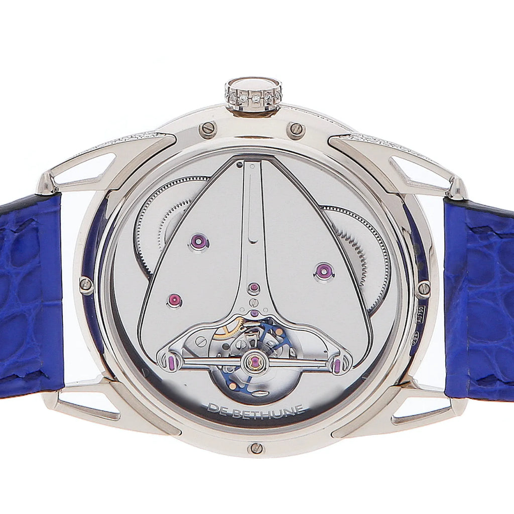 Pre-Owned De Bethune DB25 Jewelry Limited Edition (DB25SJNVMWS3) manual wind watch, features a 40mm 18k white gold case with a diamond bezel and lugs surrounding a lapis Lazuli diamond dial on a blue alligator strap with an 18k white gold tang buckle. Functions include hours and minutes. This watch comes with the original box and warranty. This is a Limited Edition piece of 3! Time remaining on the factory warranty!