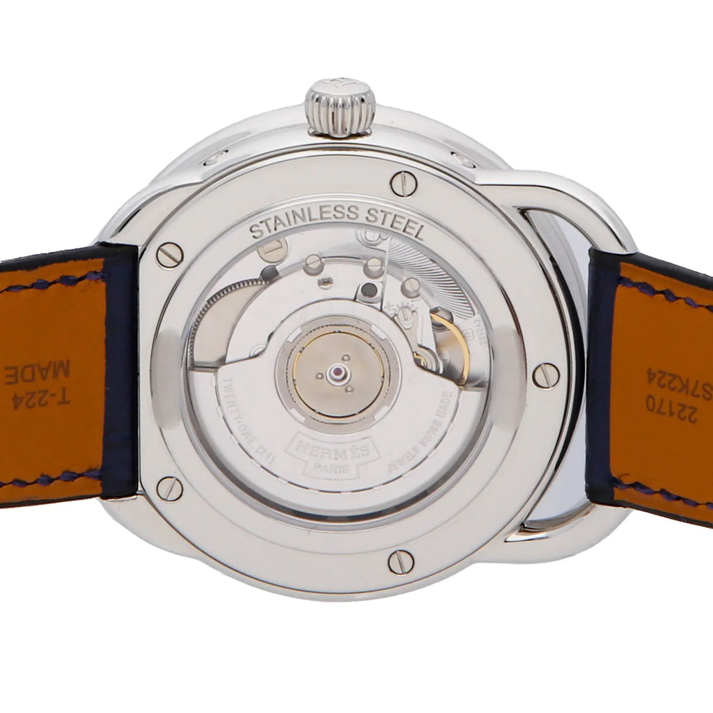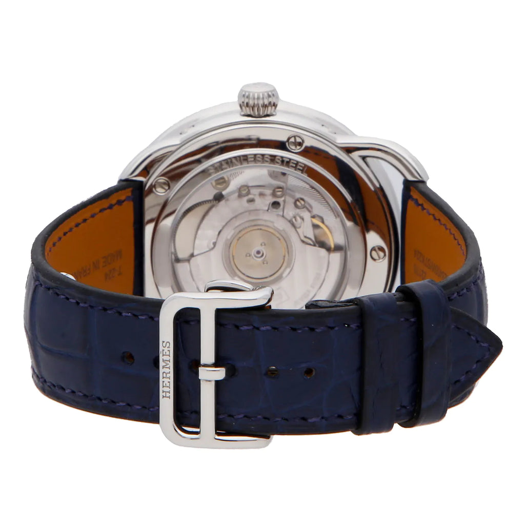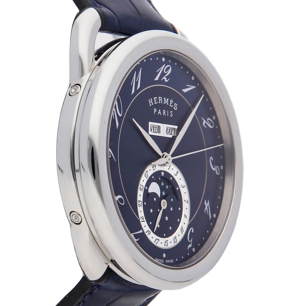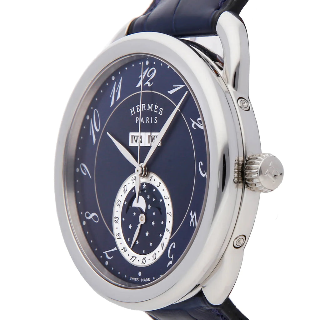 Pre-Owned Hermès Arceau Grande Lune (W055912WW00) self - winding automatic watch, featuresa 43mm stainless steel surrounding a blue dial on a brand new blue alligator strap with stainless steel deployant buckle. Functions include hours, minutes, seconds, day, date and month. This watch comes complete with box and papers. Majority of time remaining on the factory warranty!
