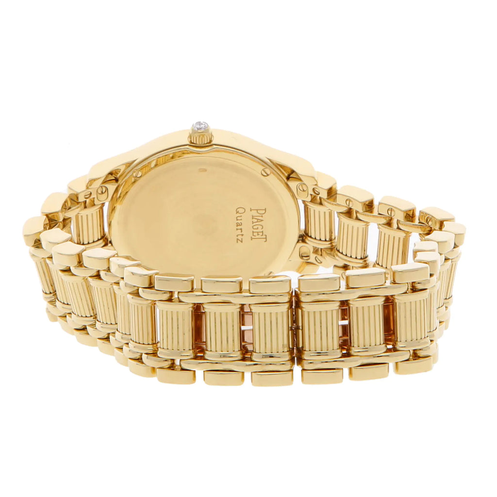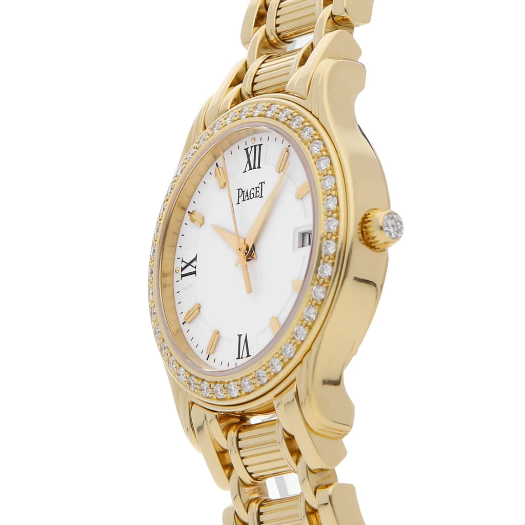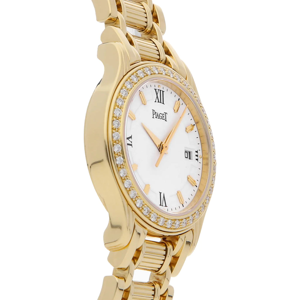 Pre-Owned Piaget Polo (G0A18268) quartz watch, features a 29mm 18k yellow gold case with a diamond bezel surrounding a white dial on an 18k yellow gold bracelet with folding buckle. Functions include hours, minutes, seconds and date. This watch has been serviced and comes complete with box and papers. Time remaining on the Manufacturer's service warranty!