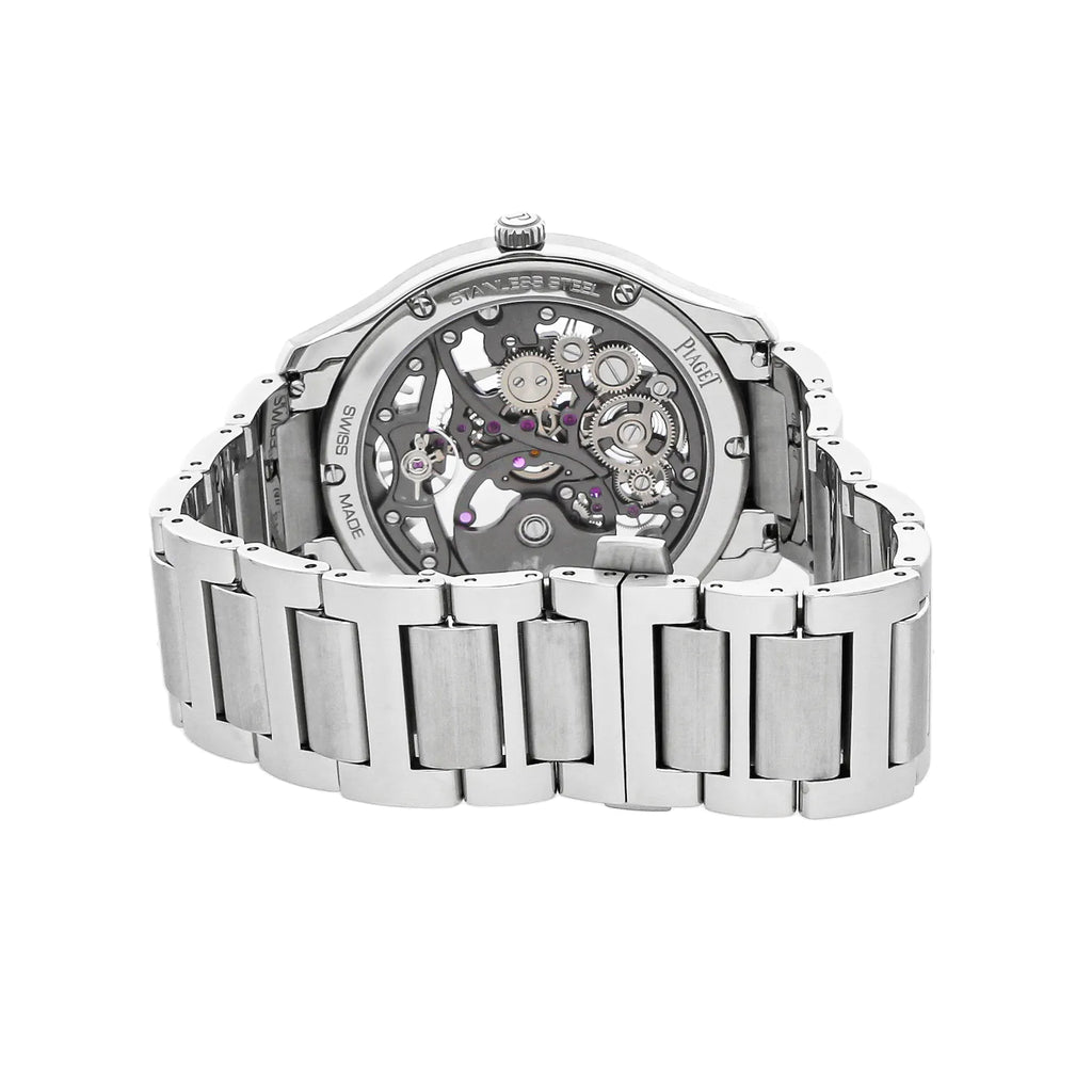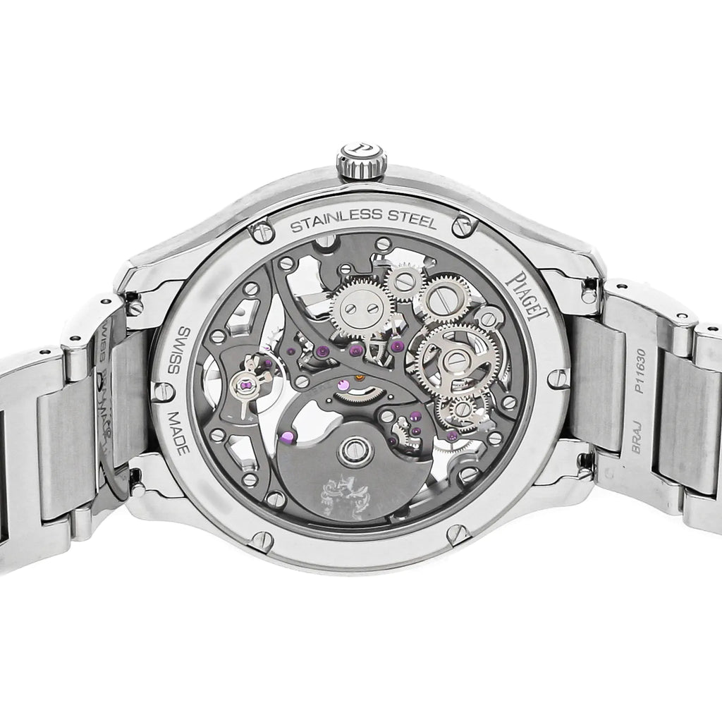 Pre-Owned Piaget Polo (G0A45001) self - winding automatic watch, features a 42mm stainless steel case surrounding a skeleton dial on a stainless steel bracelet with folding buckle. Functions include hours and minutes. This watch comes complete with box and papers. Time remaining on the factory warranty! This watch will be ready to ship in 5-7 days!
