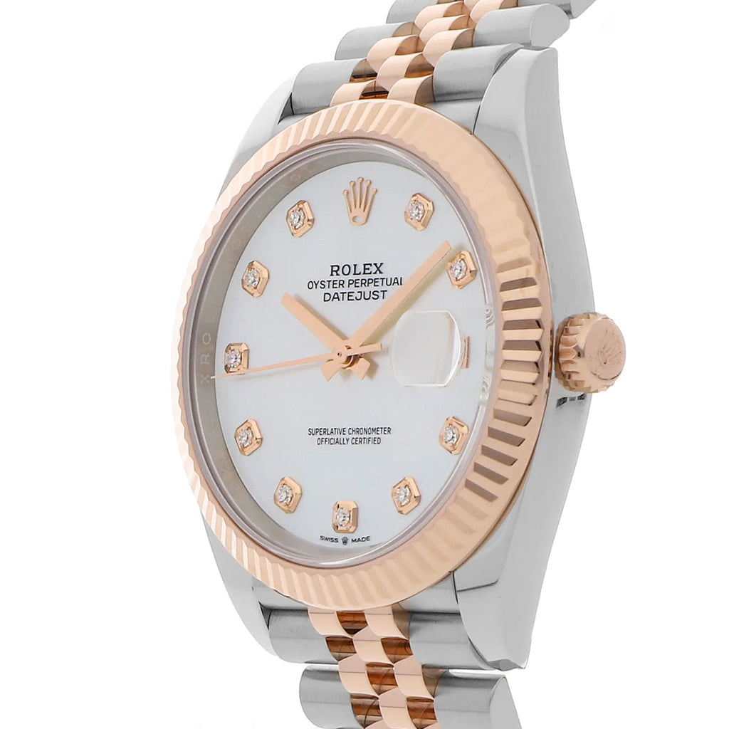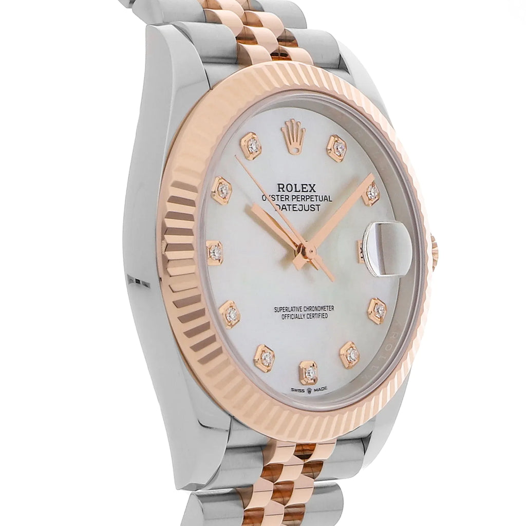 Pre-Owned Rolex Datejust (126331) self - winding automatic watch, features a 41mm stainless steel case with an 18k Everose gold fluted bezel surrounding a white mother-of-pearl diamond dial on a stainless steel and 18k Everose gold Jubilee bracelet with folding buckle. Functions include hours, minutes, seconds and date. This watch comes with an original warranty. Scattered Serial. Time remaining on the factory warranty! This watch will be ready to ship in 5-7 days!