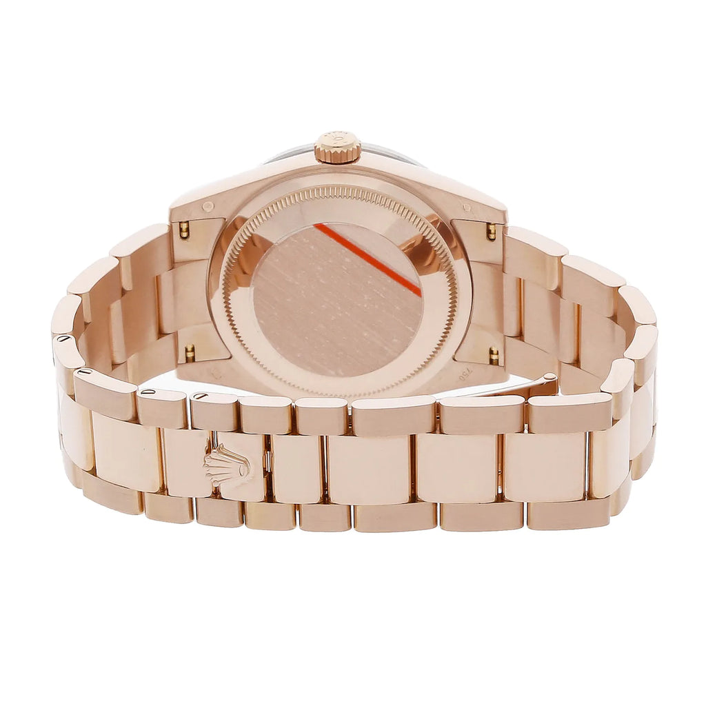 Pre-Owned Rolex Day-Date (118395BR) self - winding automatic watch, features a 36mm 18k Everose gold case with an 18k white gold and diamond bezel surrounding a diamond carousel dial on an 18k Everose gold Oyster bracelet with folding buckle. Functions include hours, minutes, seconds, day and date. This watch comes with the original warranty. Scattered Serial. Majority of time remaining on the factory warranty!