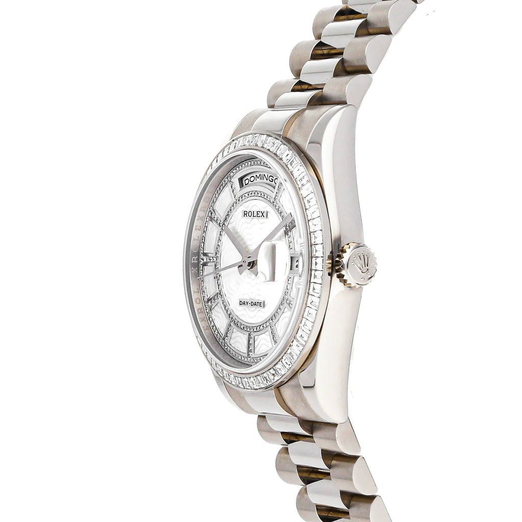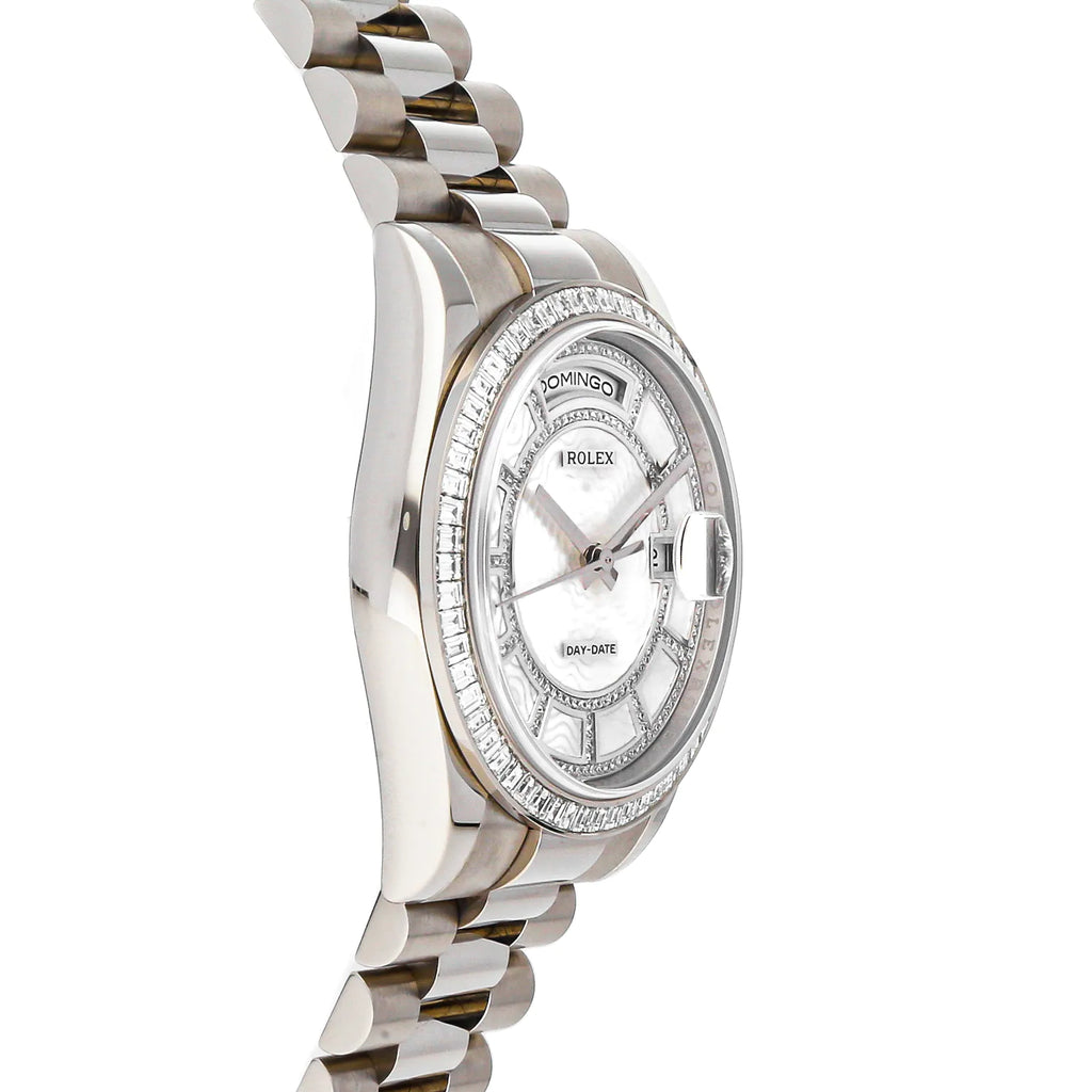 Pre-Owned Rolex Day-Date (118399BR) self - winding automatic watch, features a 36mm 18k white gold case with a diamond bezel surrounding a white mother-of-pearl carousel diamond dial on an 18k white gold President bracelet with folding buckle. Functions include hours, minutes, seconds, day and date. This watch comes with the original box and warranty. Scattered Serial. Time remaining on the factory warranty!