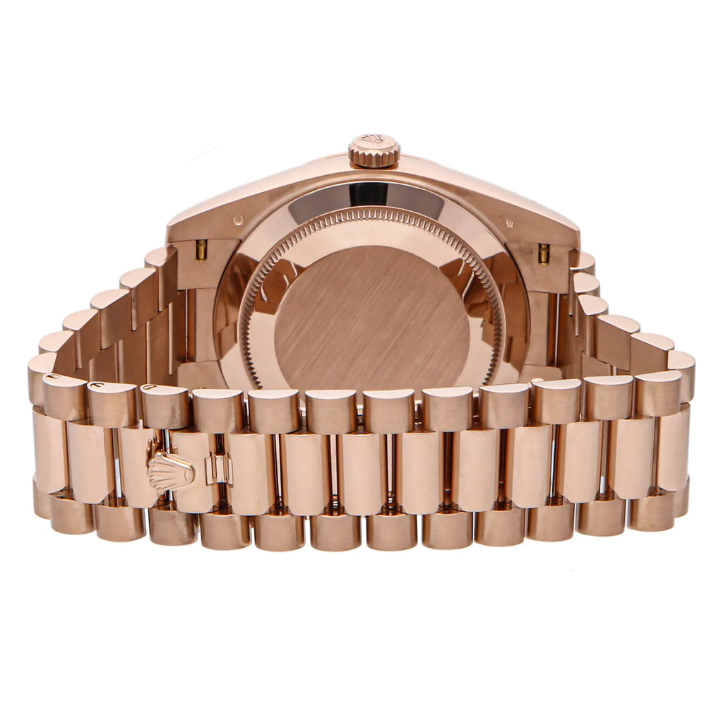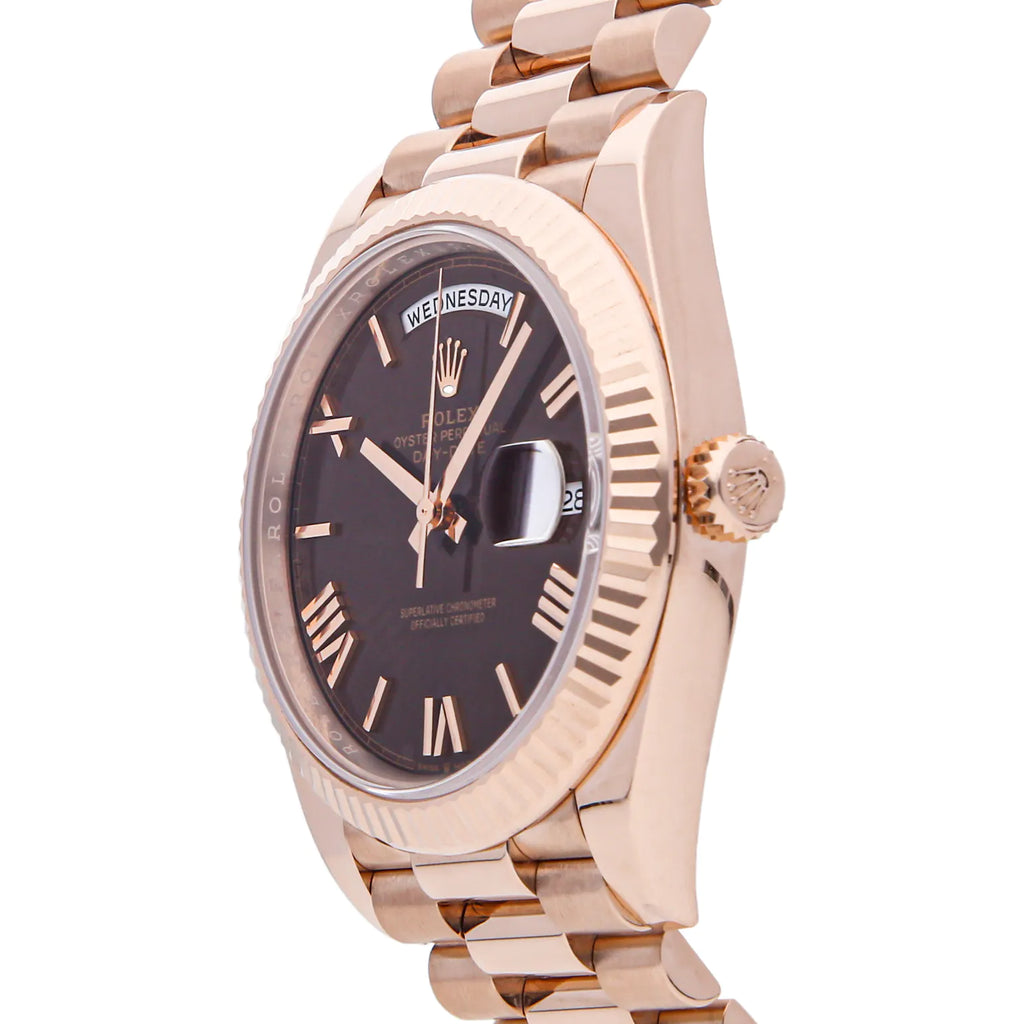 Pre-Owned Rolex Day-Date 40 (228235) self-winding automatic watch, features a 40mm 18k Everose gold case surrounding a brown dial on an 18k Everose gold President bracelet with folding buckle. Functions include hours, minutes, seconds, day and date. This watch does not come with box or papers. Scattered Serial. We back this watch with a 2-Year Watchbox warranty!