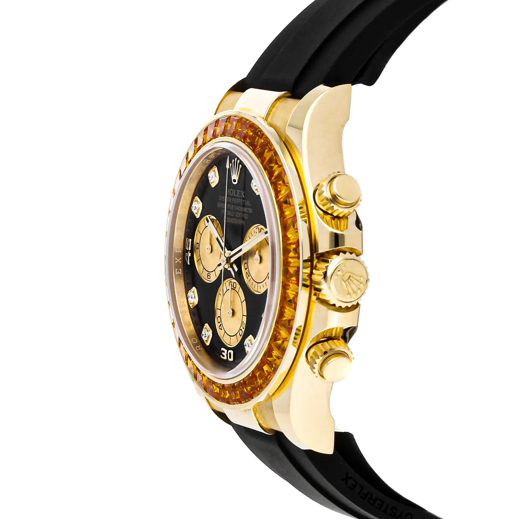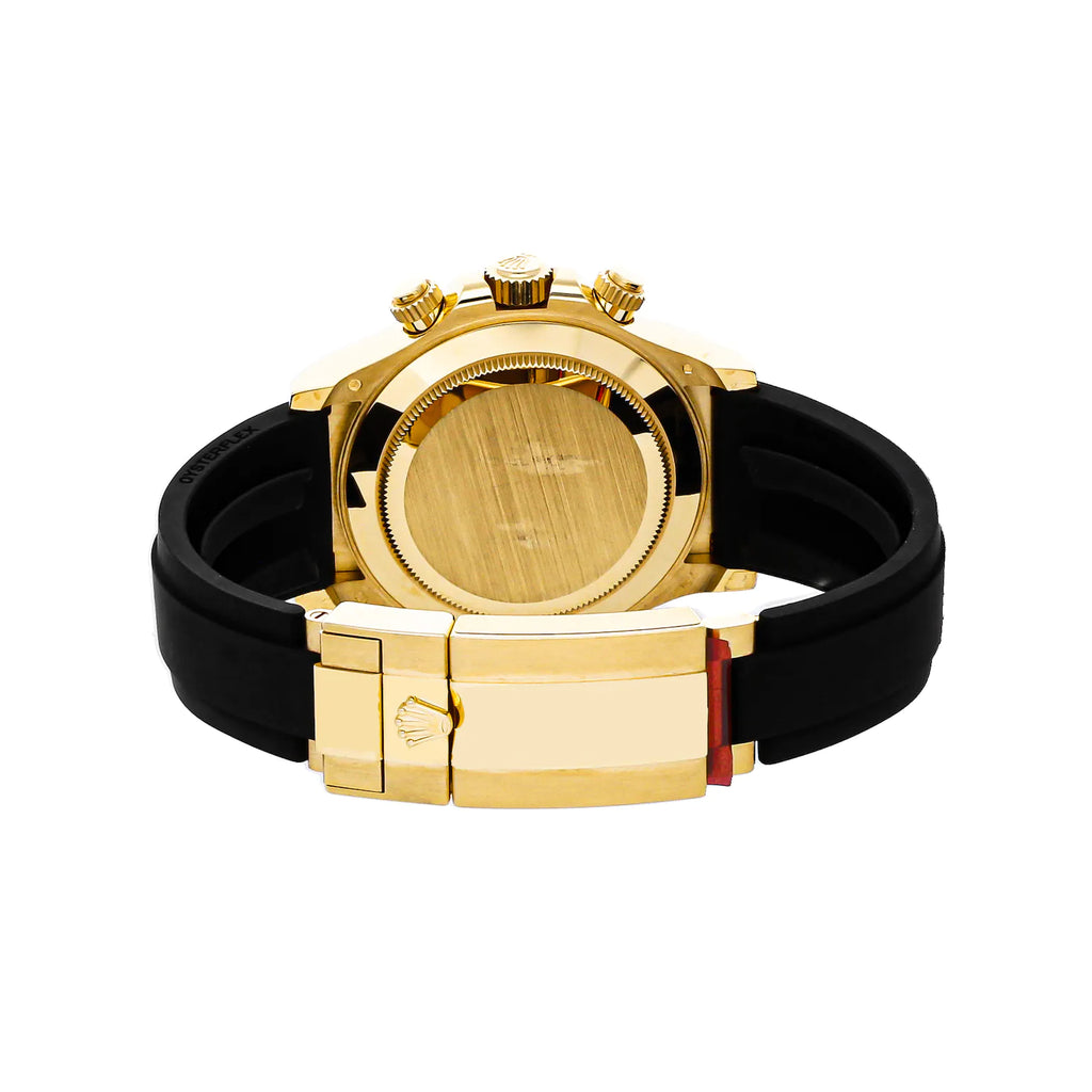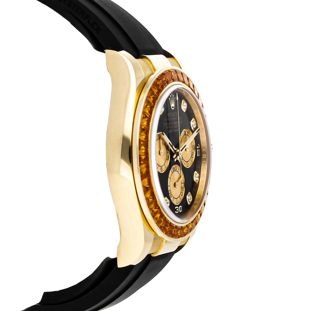 Coming soon! This item will be available to ship in 3-6 weeks. Photo is representative-only. Pre-Owned Rolex Daytona Cosmograph (116588SACO) self - winding automatic watch, features a 40mm 18k yellow gold case surrounding a black diamond dial on a black rubber strap with an 18k yellow gold deployant buckle. Functions include hours, minutes, small seconds, chronograph and tachymeter. This watch comes complete with box and papers. Scattered Serial. Time remaining on the factory warranty!