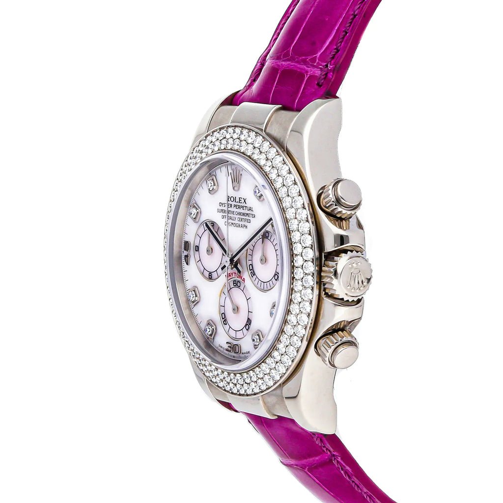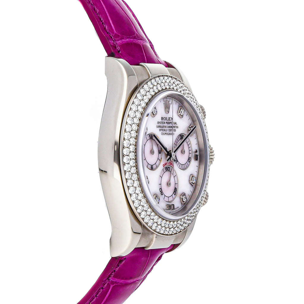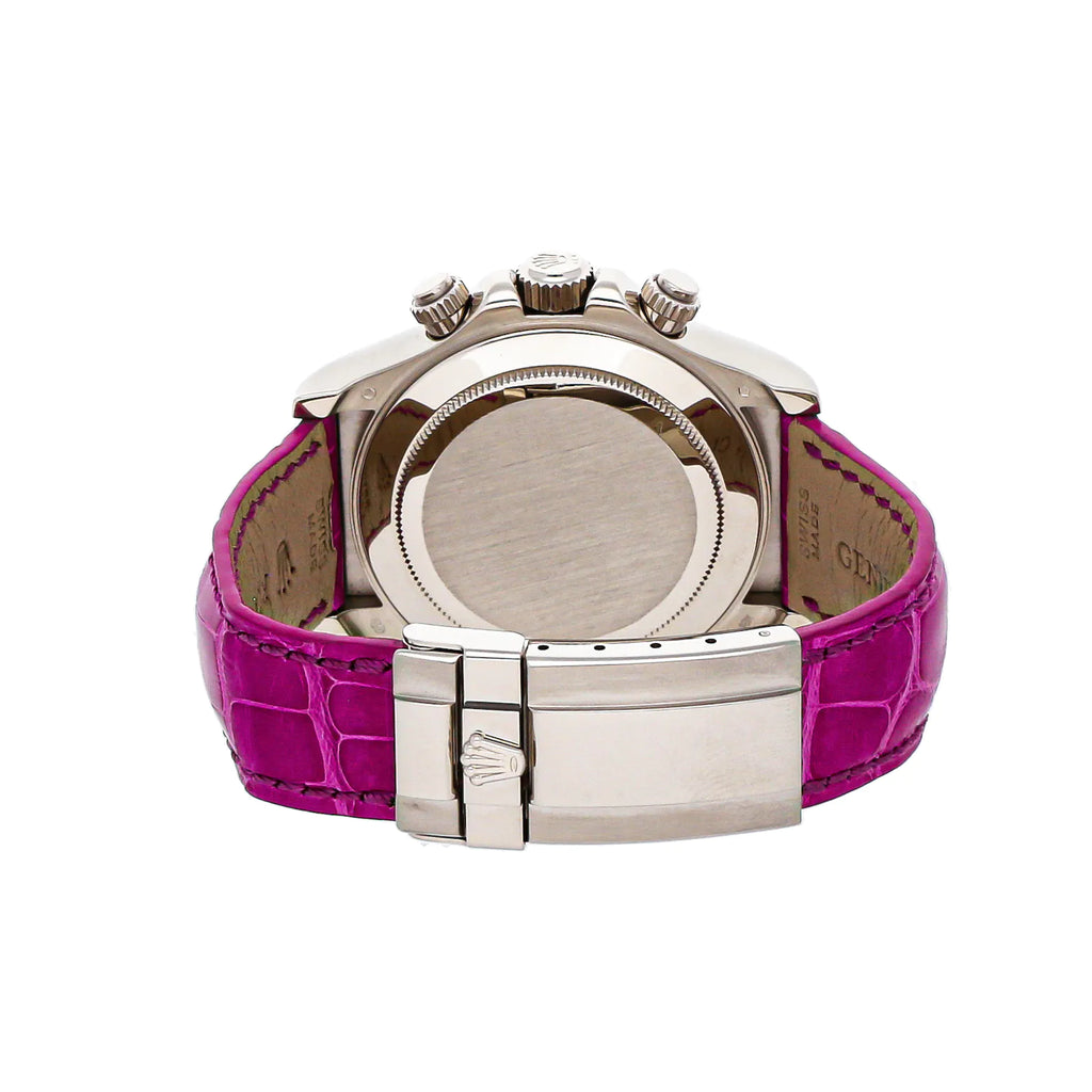 Pre-Owned Rolex Daytona Cosmograph (116589RBR) self - winding automatic watch, features a 40mm 18k white gold case with a diamond bezel surrounding a pink mother-of-pearl diamond dial on a fuschia pink alligator strap with an 18k white gold deployant buckle. Functions include hours, minutes, small seconds, chronograph and tachymeter. This watch has been serviced and does not come with box or papers. Time remaining on the Manufacturer's service warranty!