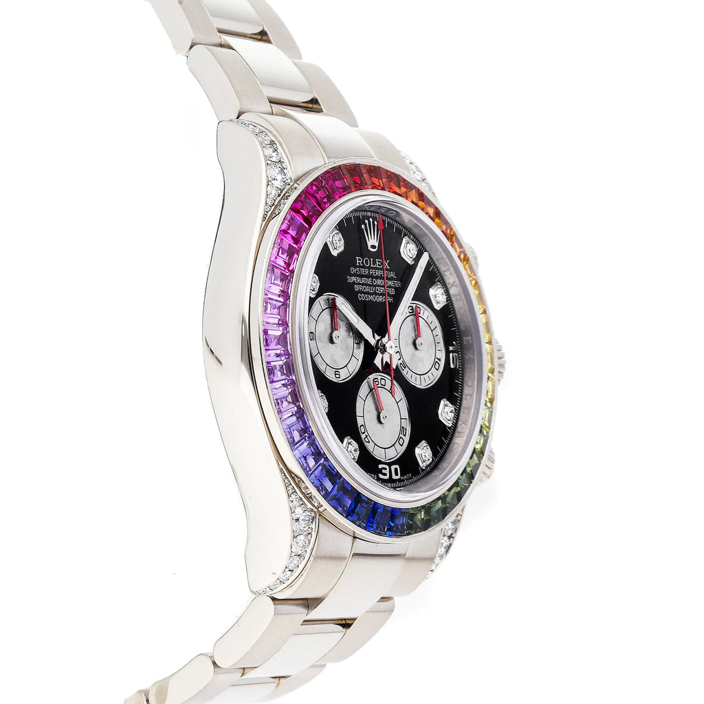 Pre-Owned Rolex Daytona Cosmograph (116599RBOW) self-winding automatic watch, features a 40mm 18k white gold case with a raindbow sapphire bezel with diamond lugs surrounding a diamond dial on an 18k white gold Oyster bracelet with folding buckle. Functions include hours, minutes, small seconds, chronograph and tachymeter. This watch comes complete with box and papers. G Serial. We back this watch with a 2-Year Watchbox warranty!