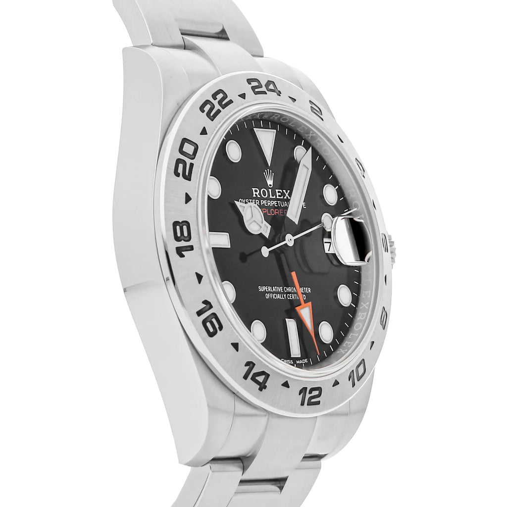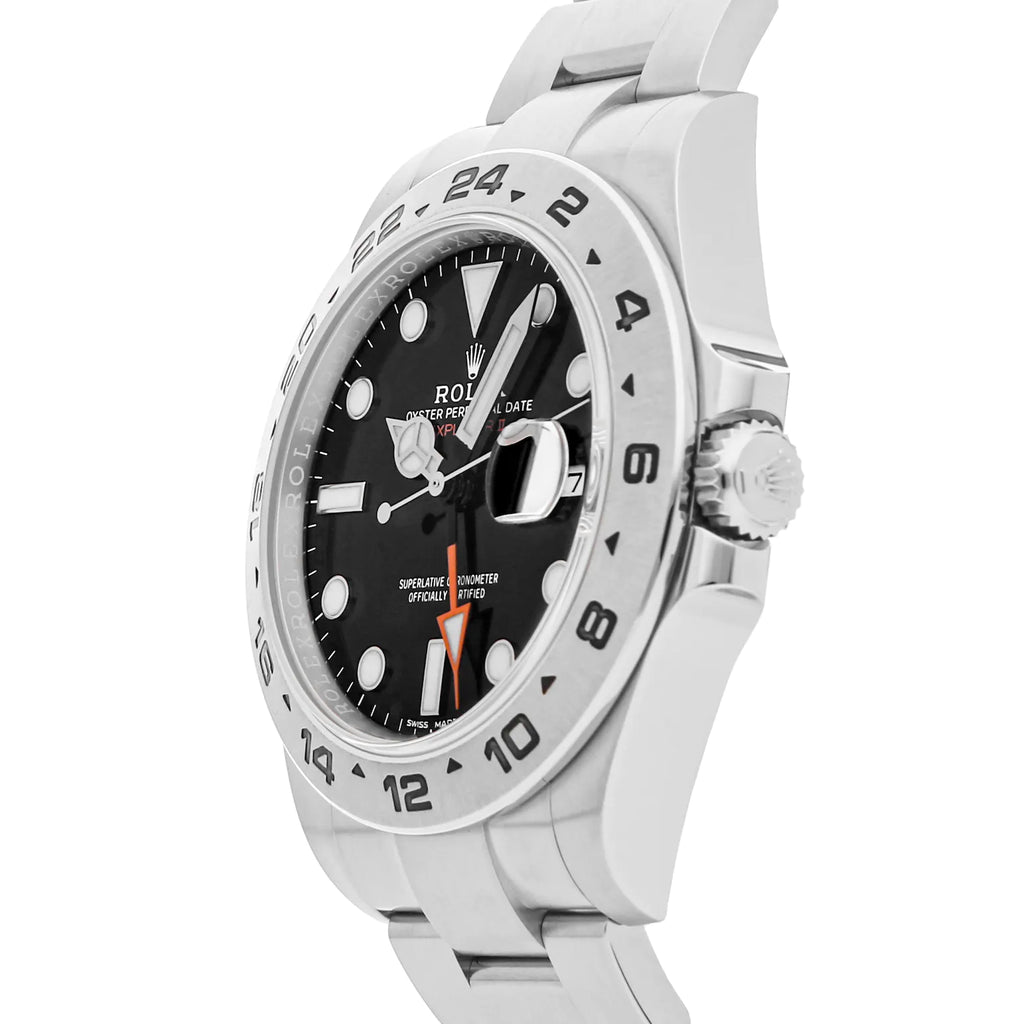 Pre-Owned Rolex Explorer II (216570) self - winding automatic watch, features a 42mm stainless steel case surrounding a black dial on a stainless steel Oyster bracelet with folding buckle. Functions include hours, minutes, seconds, date and GMT. This watch comes complete with box and papers. Scattered Serial. Time remaining on the factory warranty!
