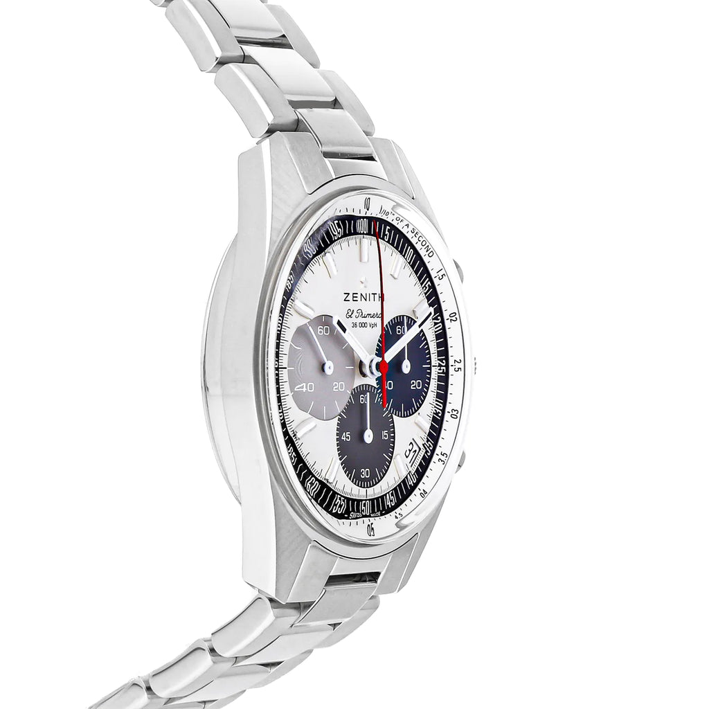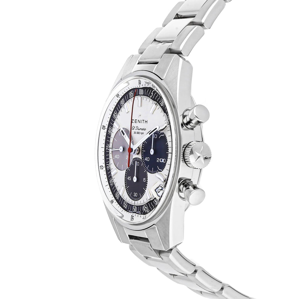Pre-Owned Zenith Chronomaster Original (033200360069M3200) self - winding automatic watch, features a 38mm stainless steel case surrounding a white dial on a stainless steel bracelet with folding buckle. Functions include hours, minutes, small seconds, date, chronograph and tachymeter. This watch comes complete with box and papers. Majority of time remaining on the factory warranty!