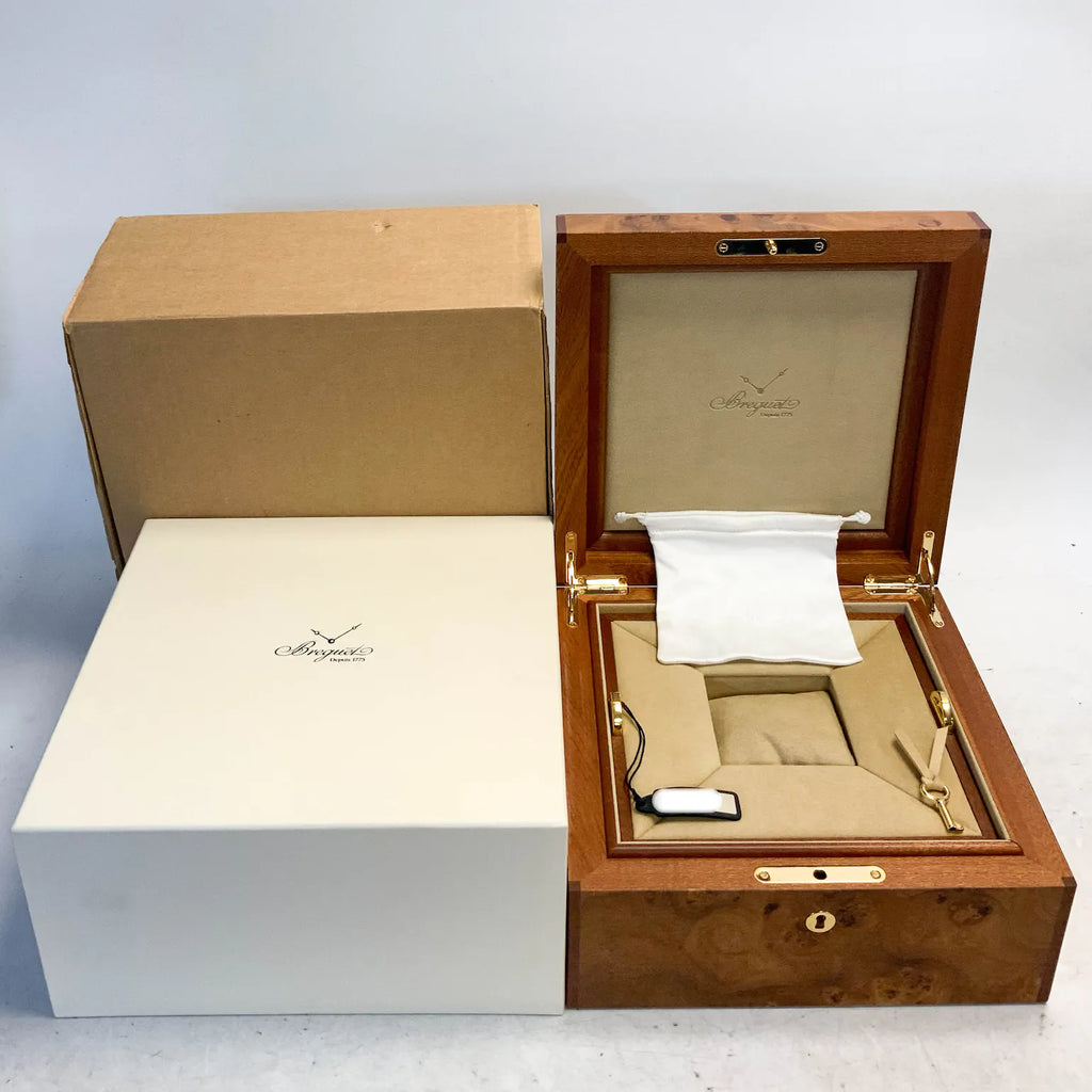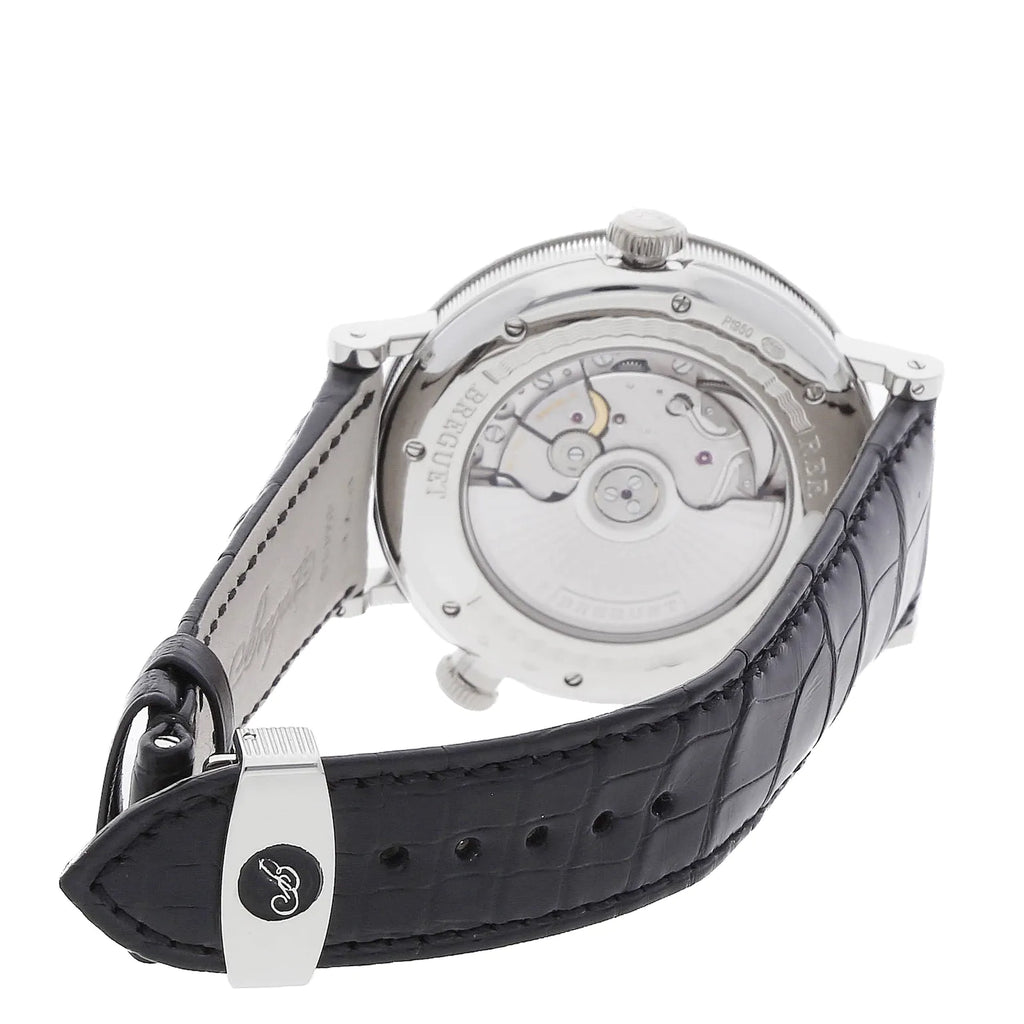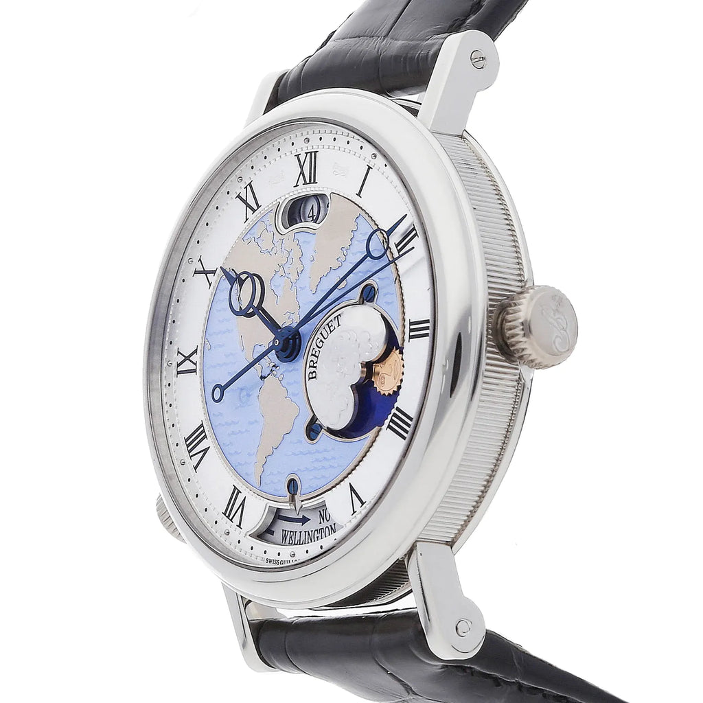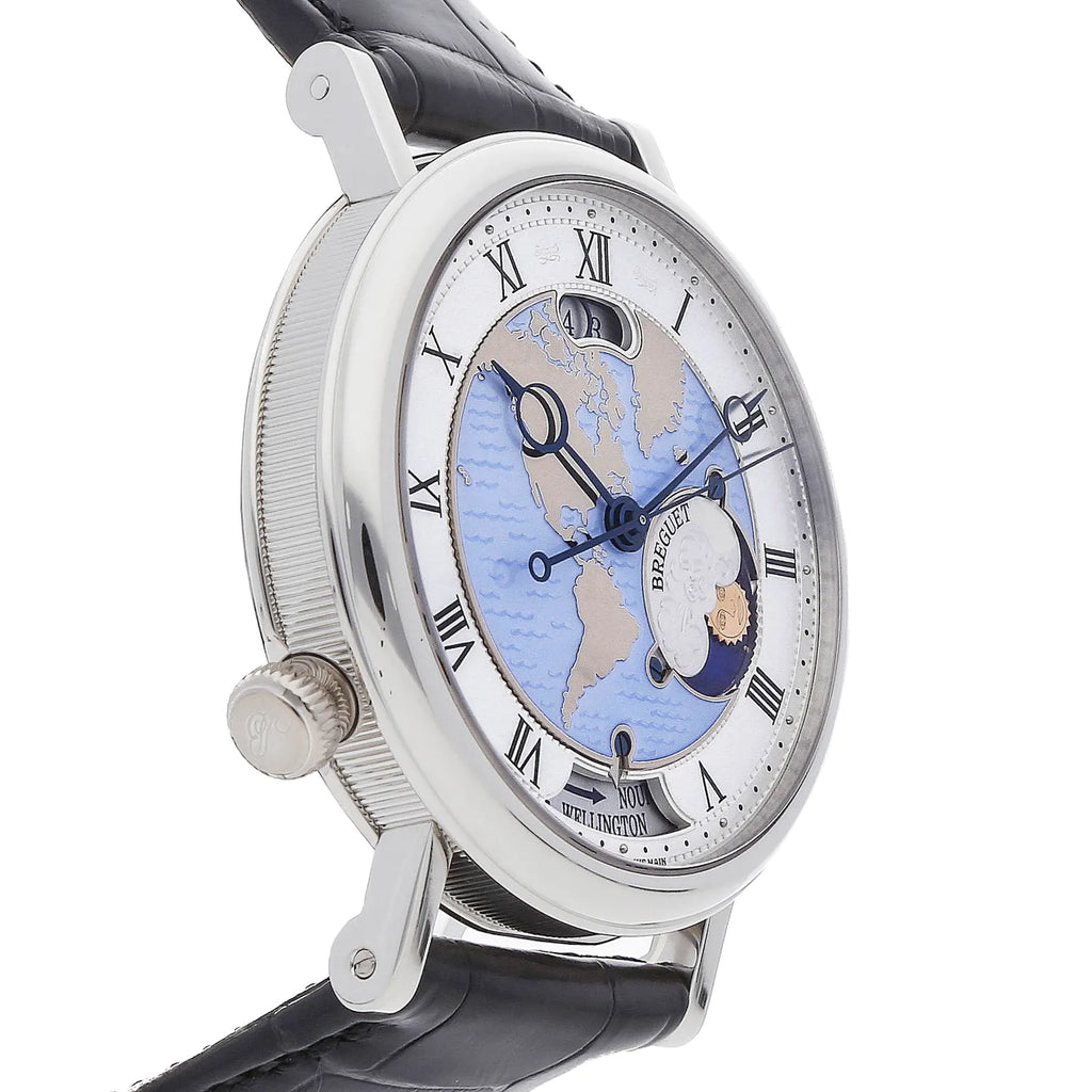 Pre-Owned Breguet Classique Hora Mundi (5717PTUS9ZU) self - winding automatic watch, features a 43mm platinum case surrounding a blue "America" dial on a brand new black alligator strap with a platinum deployant buckle. Functions include hours, minutes, seconds, date, day/night indicator and gmt/world time. This watch comes with the original box. We back this watch with a 2-Year WatchBox warranty!