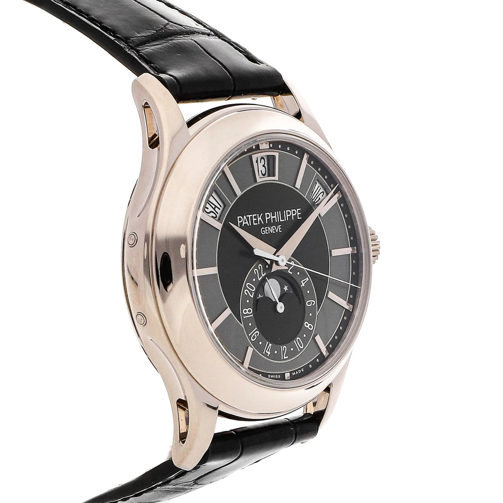 Pre-Owned Patek Philippe Complications Annual Calendar (5205G010) self - winding automatic watch, features a 40mm 18k white gold case surrounding a black/gray dial on a black alligator strap with an 18k white gold Calatrava Cross deployant buckle. Functions include hours, minutes, seconds, day, date, month, moon phase, annual calendar and GMT. This watch comes with the original warranty and instruction manual. We back this watch with a 2-Year Watchbox warranty!