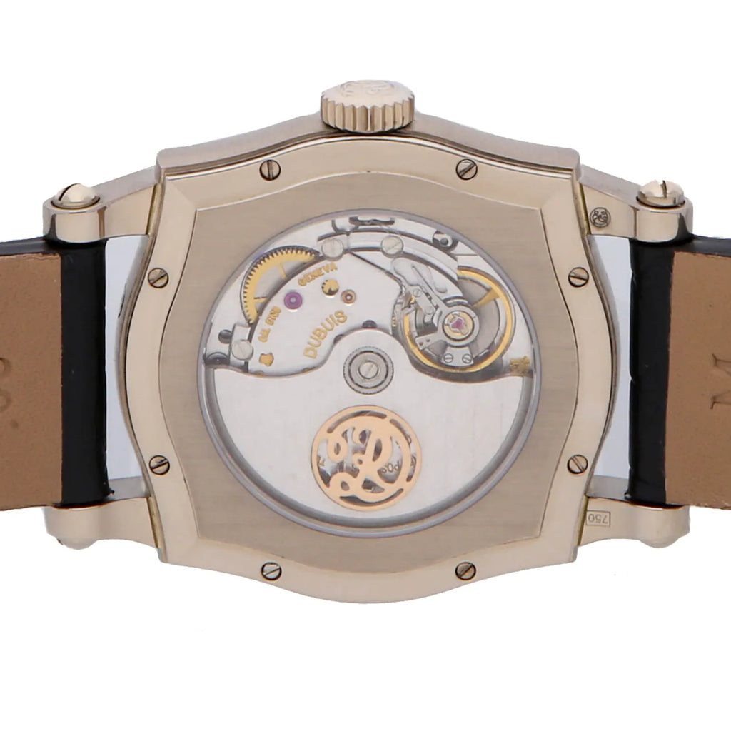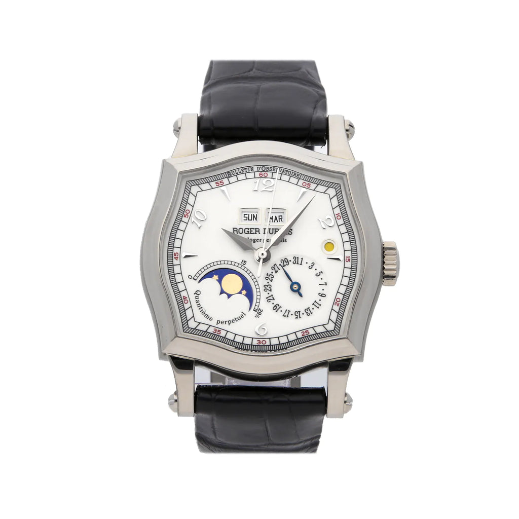 Pre-Owned Roger Dubuis Sympathie Perpetual Calendar (S3757390) self-winding automatic watch, features a 37mm 18k white gold case surrounding an ivory dial on a brand new black alligator strap with an 18k white gold tang buckle. Functions include hours, minutes, seconds, retrograde day, retrograde date, month, perpetual calendar and moon phase. This watch comes complete with box and papers. We back this watch with a 2-Year WatchBox warranty!