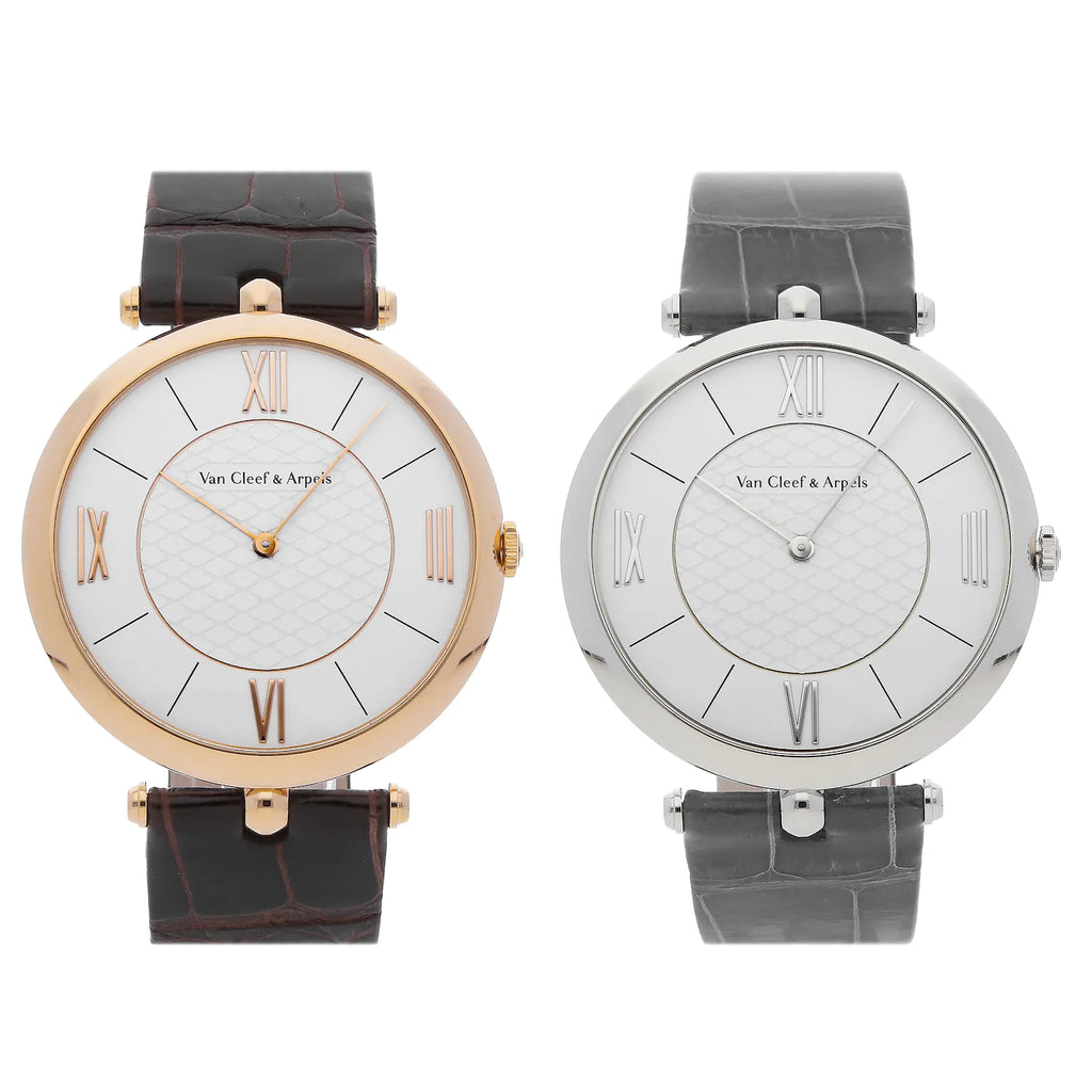 Pre-Owned Van Cleef & Arpels Pierre Arpels Two Piece Set (PierreArpelsRGWGSet) VCARO3GO00 manual wind watch, features a 42mm rose gold case surrounding a white lacquer honeycomb motif dial on a brown alligator strap with an 18k rose gold tang buckle. Functions include hours and minutes. VCARO3GM000 self - winding automatic watch, features a 42mm 18k white gold case surrounding a white lacquer honeycomb motif dial on a brown alligator strap with an 18k white gold tang buckle. Functions include hours and minutes. This set has been serviced and does not come with box or papers. Time remaining on the Manufacturer's service warranty!