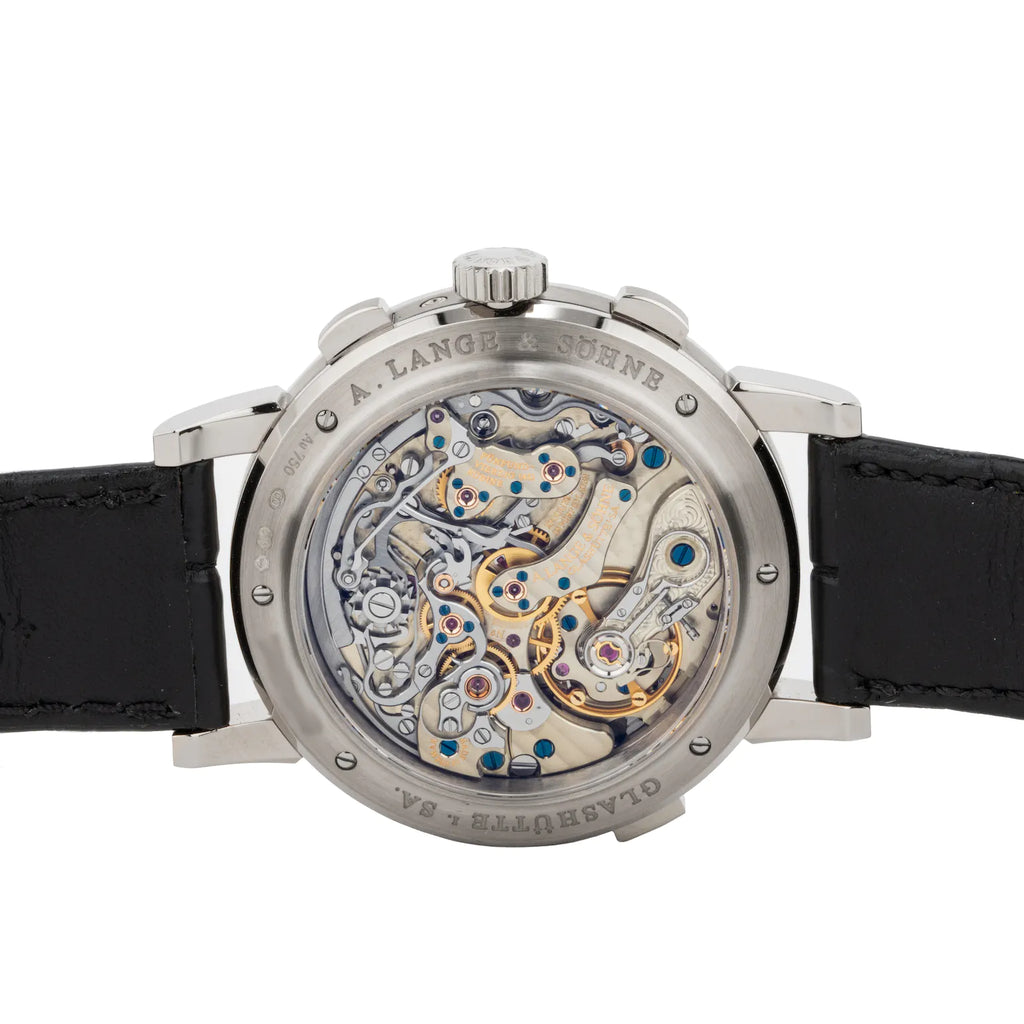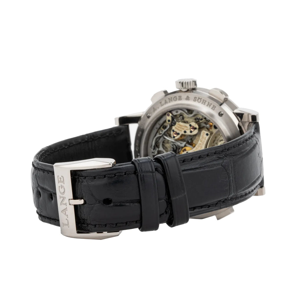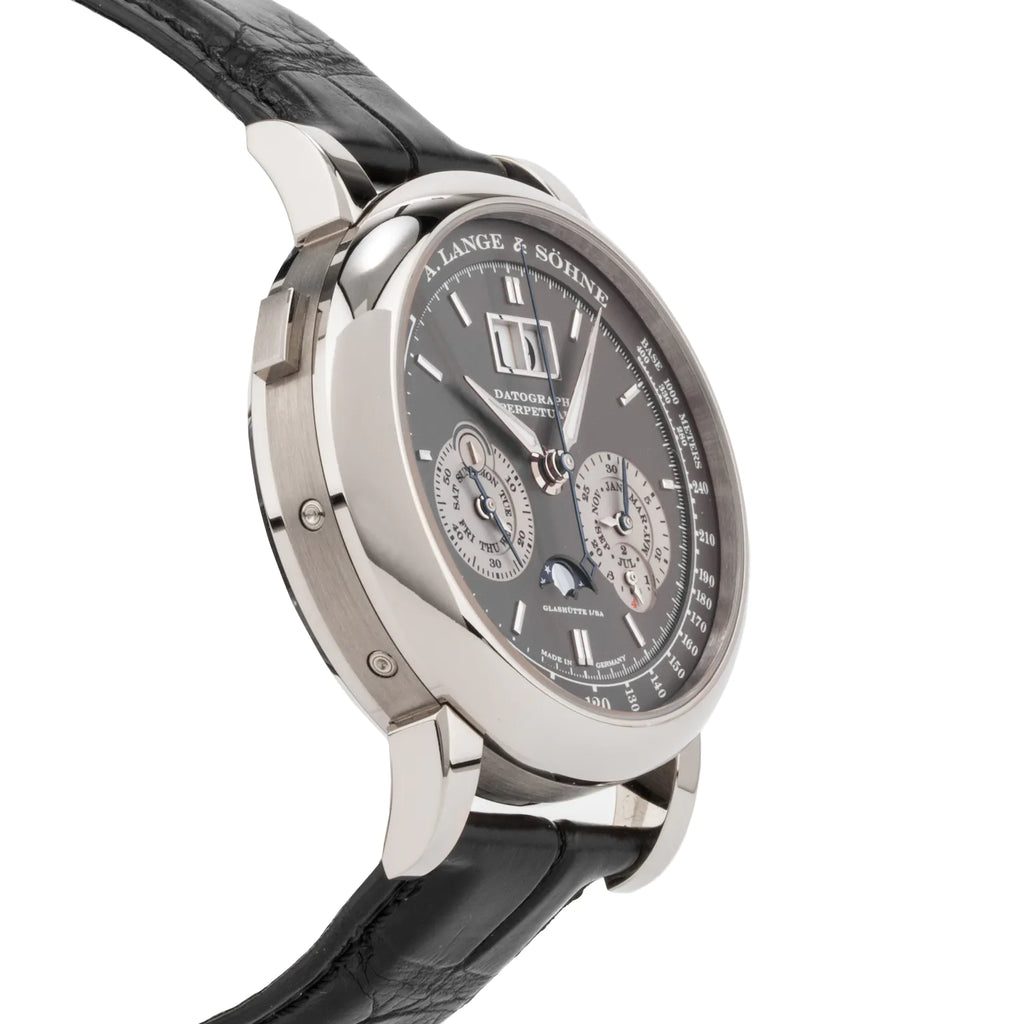 A. Lange & Söhne Datograph Perpetual Calendar (410038) manual wind watch, features a 41mm 18k white gold case surrounding a grey dial on a brand new black alligator strap with an 18k white gold tang buckle. Functions include hours, minutes, small seconds, day, date, month, moon phase and chronograph This watch comes complete with box and papers. We back this watch with a 2-Year WatchBox warranty!