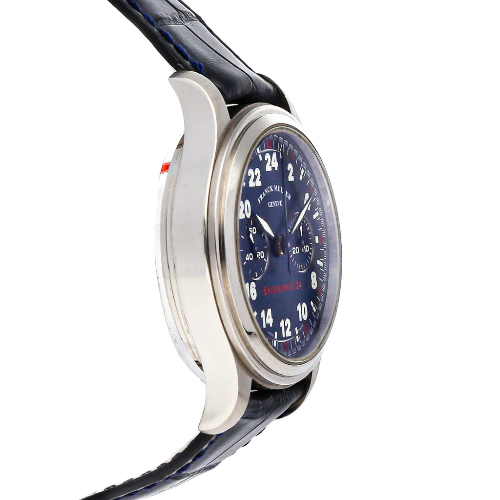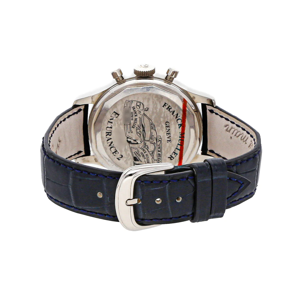 Pre-Owned Franck Muller Endurance Chronograph (9601) manual wind watch, features a 37mm 18k white gold case surrounding a black dial on a brand new navy alligator strap with a 18k white gold tang buckle. Functions include hours, minutes, seconds and date. This watch has been serviced and comes with the original box and Certificate of Authenticity. Time remaining on the Manufacturer's service warranty!