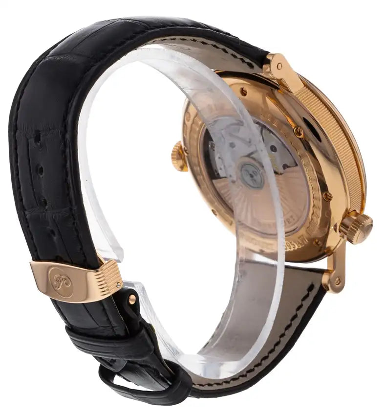 EUROPEAN AND AFRICAN CONTINENTS VERSION: This watch can memorize two separate time-zone settings. Once the watch has been correctly set to the two desired time-zones, one can instantly toggle between the two time-zones by pressing the button at the 8 o'clock position, in what Breguet calls the "INSTANT-JUMP". Ingeniously the watch not only memorizes the different time-zones, it also memorizes the AM/PM & the date correctly adjusting these complications as well according to the desired time-zone. In essence this watch "memorizes" both time-zones & its associated settings, with a push of a button the user can toggle between the two desired time-zones. This watch features: • Polished 18kt rose gold case with the Breguet signature "coined/fluted" edge.