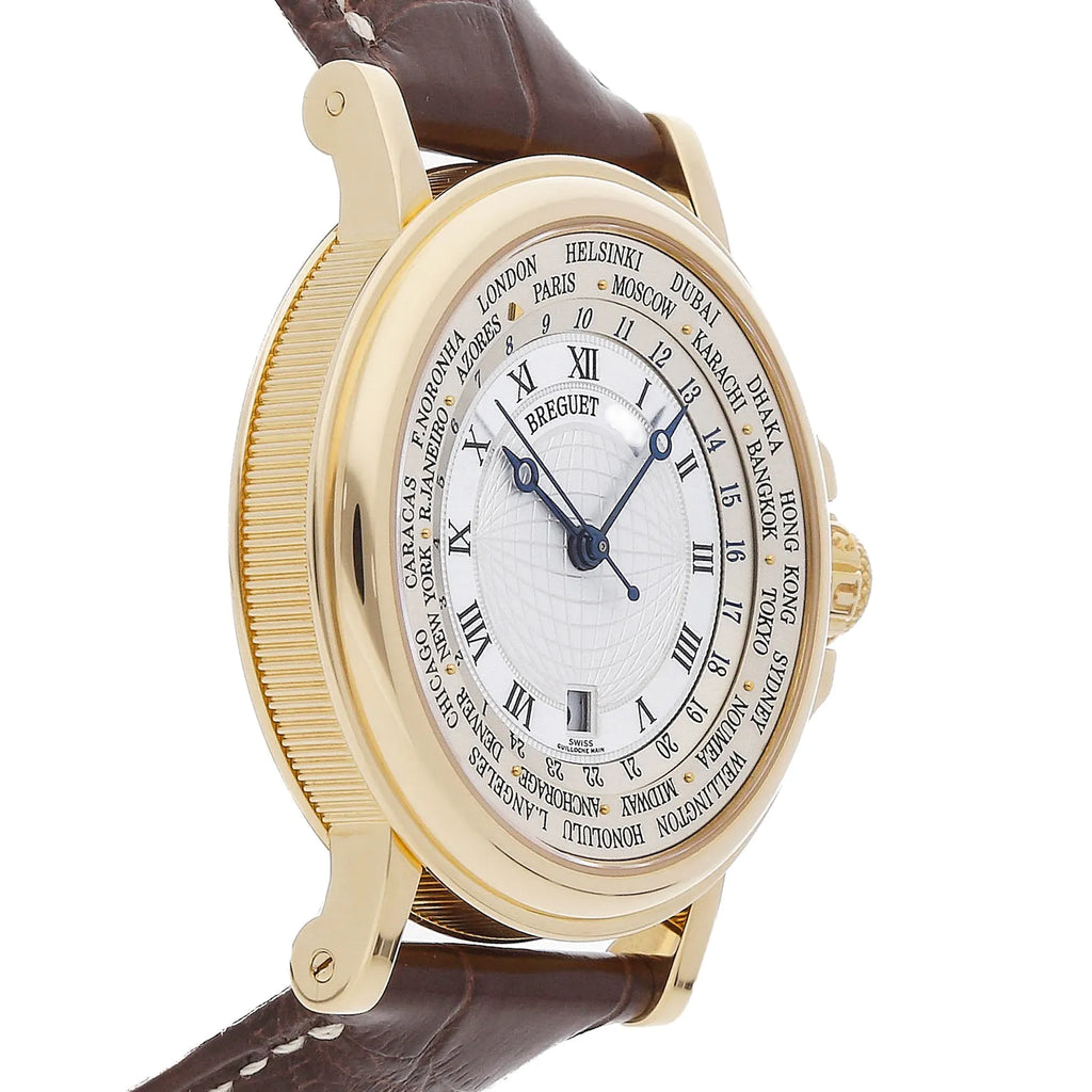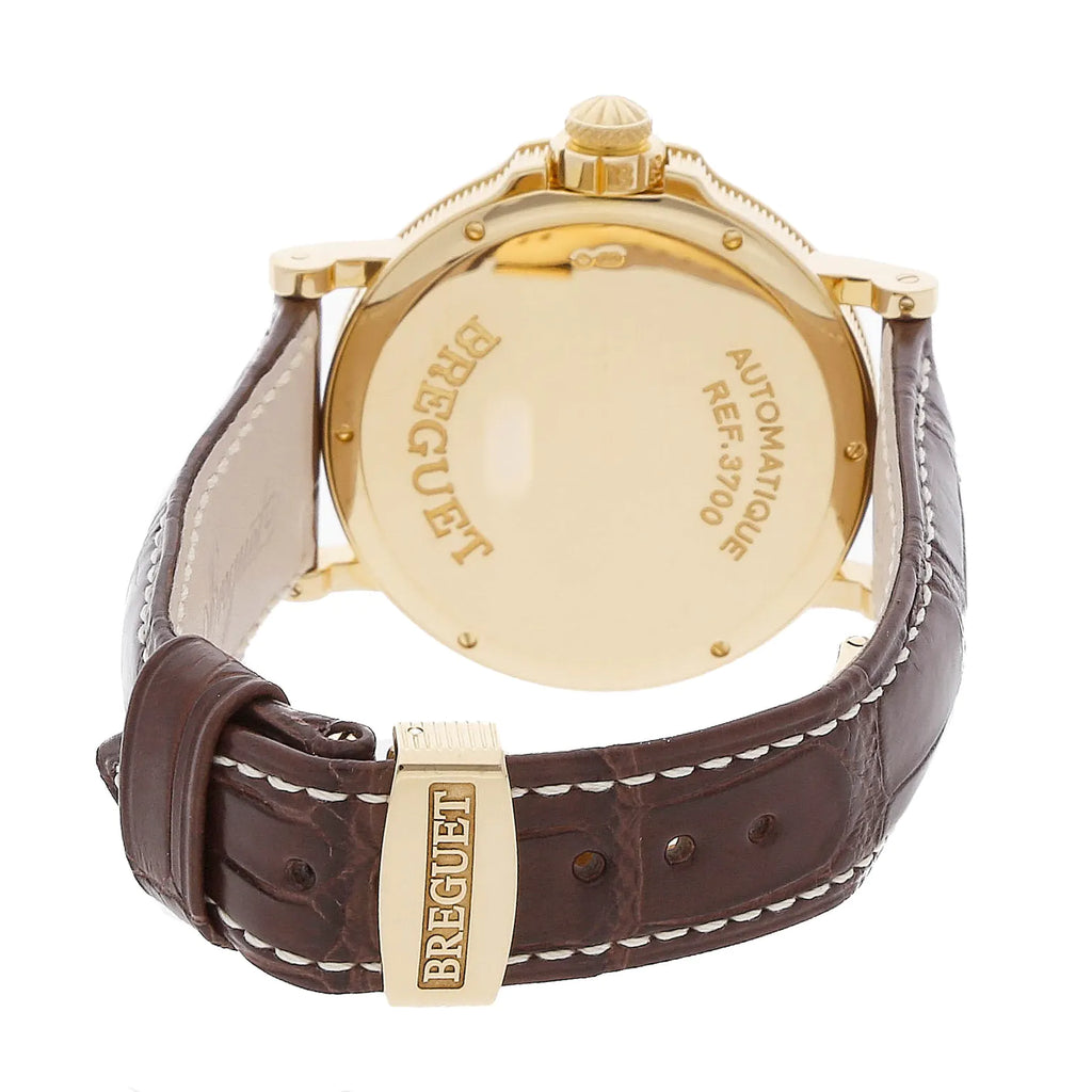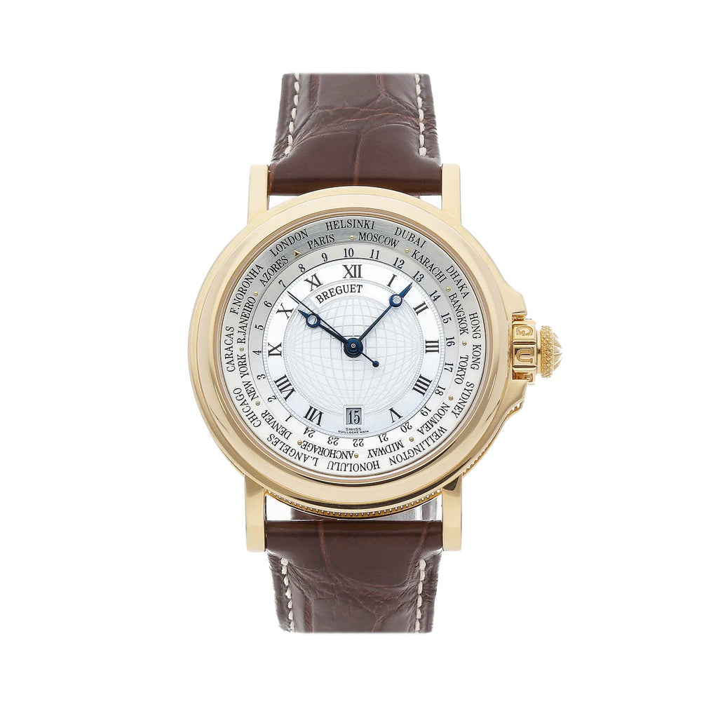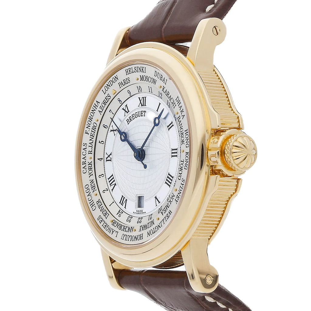 Pre-Owned Breguet Marine Hora Mundi (3700BA129V6) self - winding automatic watch, features a 38mm 18k yellow gold case surrounding a silver dial on a brand new brown alligator strap with an 18k yellow gold deployant buckle. Functions include hours, minutes seconds, date and gmt/world time. This watch comes with the original box and manual. We back this watch with a 2-Year WatchBox warranty!